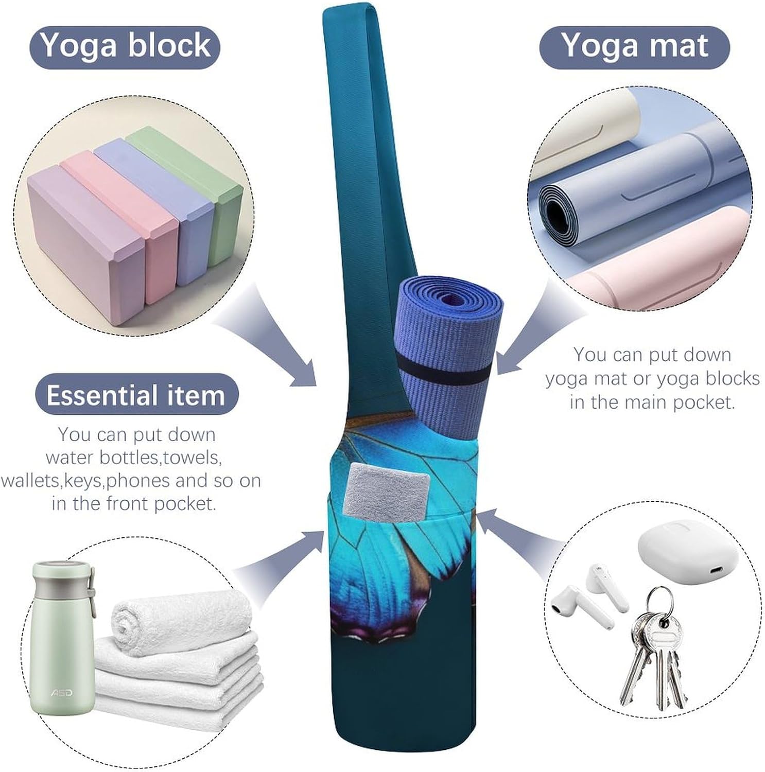 Can be used as a yoga mat bag, gym bag or Pilates bag, it is an ideal choice for yoga lovers, parents who balance fitness and travelers who need a reliable yoga gym bag Owning an excellent Beautiful Blue Butterfly printed Travel yoga gym bag can make your yoga practice easier. You don't have to worry about dirt, dust and damage because your yoga mat will be protected, and after the yoga class, just throw everything into the yoga bag and you're ready to go
