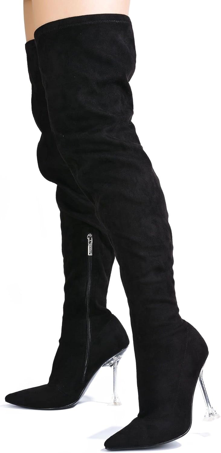 These CAPE ROBBIN thigh-high boots in BROWN are a striking and distinctive choice for evenings out. The unique, clear, odd-shaped heel ensures they stand out. They're sure to draw attention and complement any ensemble. Available in lilac, brown, black, and taupe.