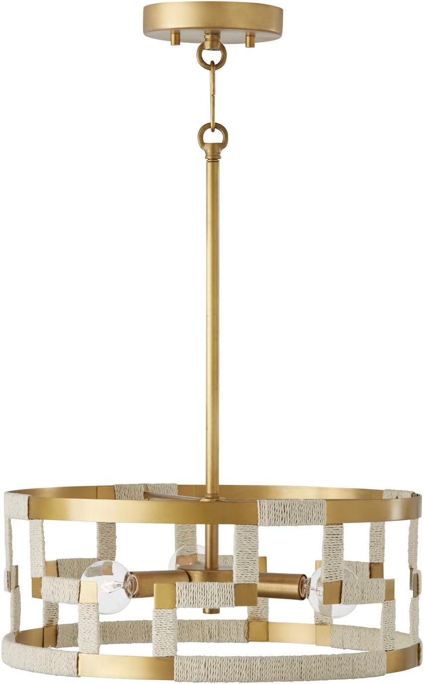 Capital Lighting 241031NL Hala Modern Greek Key Inspired Bleached Natural Jute Drum Convertible Pendant/Semi Flush Ceiling Light Fixture, 3-Light 180 Total Watts, 6" H x 15" W, Patinaed Brass