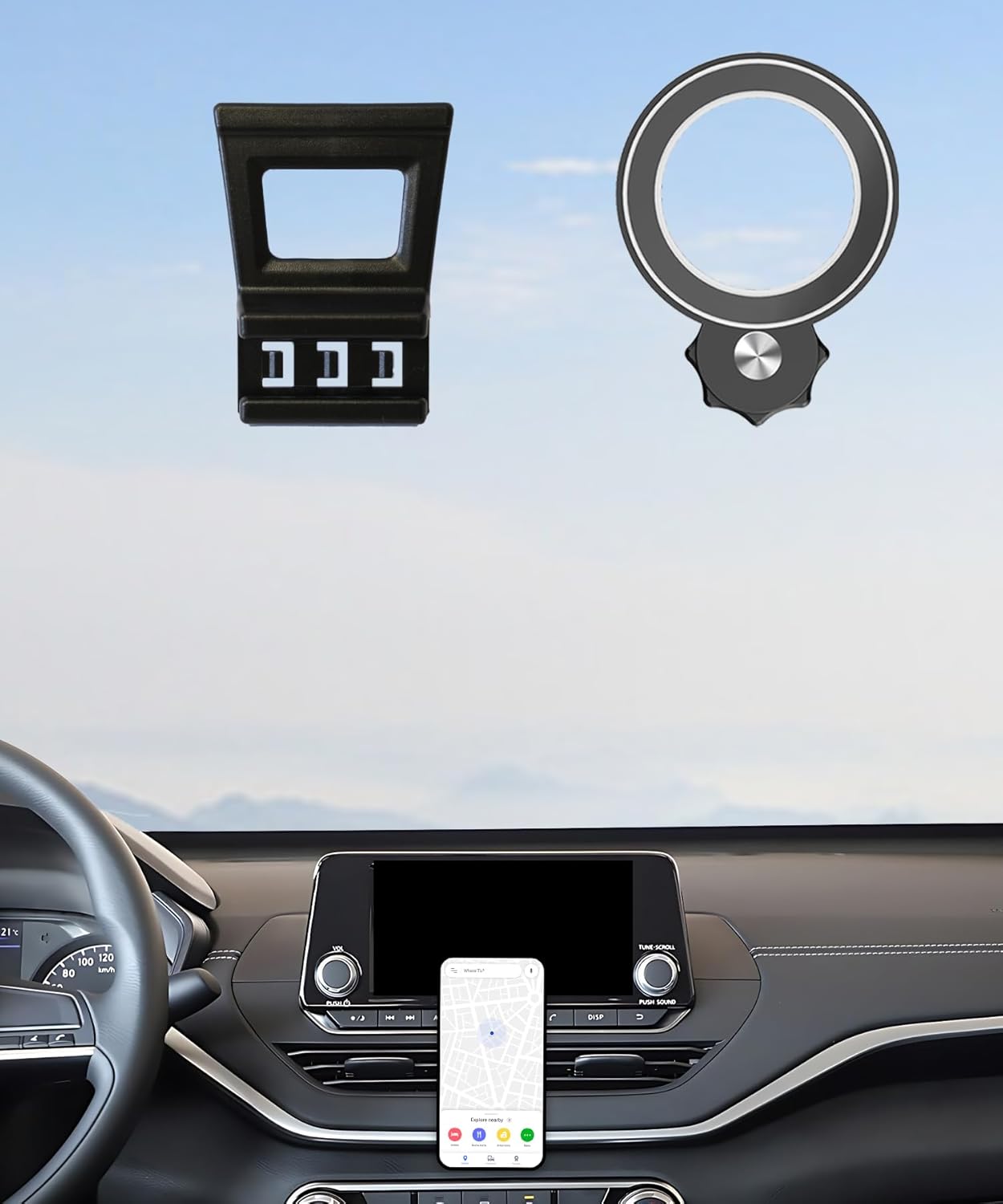 Transform your Holder for 2021 2022 2023 2024 Nissan Armada driving experience with this innovative phone mount designed specifically for 12.3-inch touch screens. This versatile mount offers seamless one-hand operation and robust magnetic attachment, ensuring your phone stays firmly in place during every journey. Compatible with iPhone series 12 through 16 and MagSafe cases, plus a wide range of other smartphones using the included metal rings. The mount features 360-degree rotation capability for optimal viewing angles and comes with two metal rings for non-MagSafe devices. Its sturdy construction and secure mounting system perform reliably across various driving conditions - from rough terrain to smooth highways. The sleek design integrates perfectly with your Armada interior while maintaining easy access to your vehicle's touch screen. Installation is straightforward, and the mount's practical design ensures it won't interfere with your vehicle's functionality. Package includes the mount and two metal rings for universal compatibility. This thoughtful solution keeps your phone within reach while maintaining focus on the road.