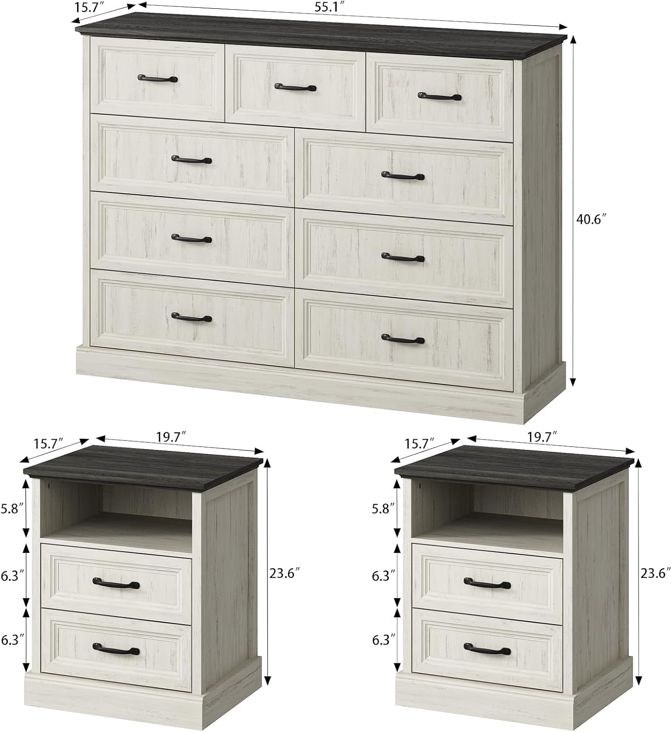 CARPETNAL Farmhouse Dresser and Nightstand Sets for Bedroom, 3 Pcs Bedroom Set, 9 Drawer Dresser & Nightstand Set of 2, Modern Wood Chest of Drawers for Bedroom, Living room, Entryway, White