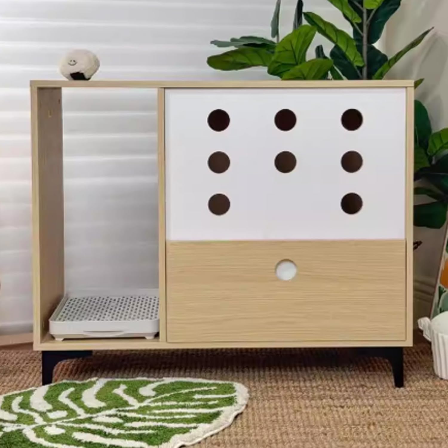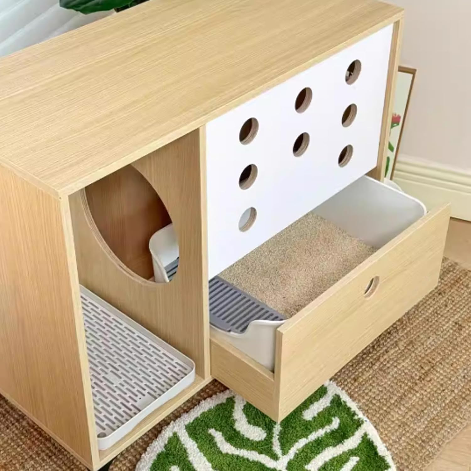 YUGXTH enclosed litter solution is designed for pet owners who want a cleaner home without compromising interior style. Serves as a litter box storage cabinet, concealing the litter box while also functioning as a side table for displaying decorative items and beautifying the space.Specifications:Product Name: Hidden Litter Box, Hidden Cat Litter Box Furniture, Cat Litter Box Enclosure Furniture, Hidden Litter Box FurnitureMaterial: Solid Wood Eco-boardColor: Natural + WhiteLength: 85cm/33.4inWidth: 40cm/15.7inHeight: 60cm/23.6inLeg Height: 12cm/4.7inSuitable Litter Box Size: 50*35CMApplicable Scene: Daily home useAssembly Required: YesPackage Includes:1 x Cat Litter Box Cabinet1 x Stainless Steel Cat Litter BoxPurchase Notes:1. The product you ordered only includes the cat litter box cabinet, not the cat litter box itself.2. Due to factors such as lighting, shooting, and monitor settings, there may be differences between the picture and the actual product color. Please refer to the actual product.3. The dimensions of this product are measured manually and may have an error of 1-3 cm. Please refer to the actual product for specific dimensions.