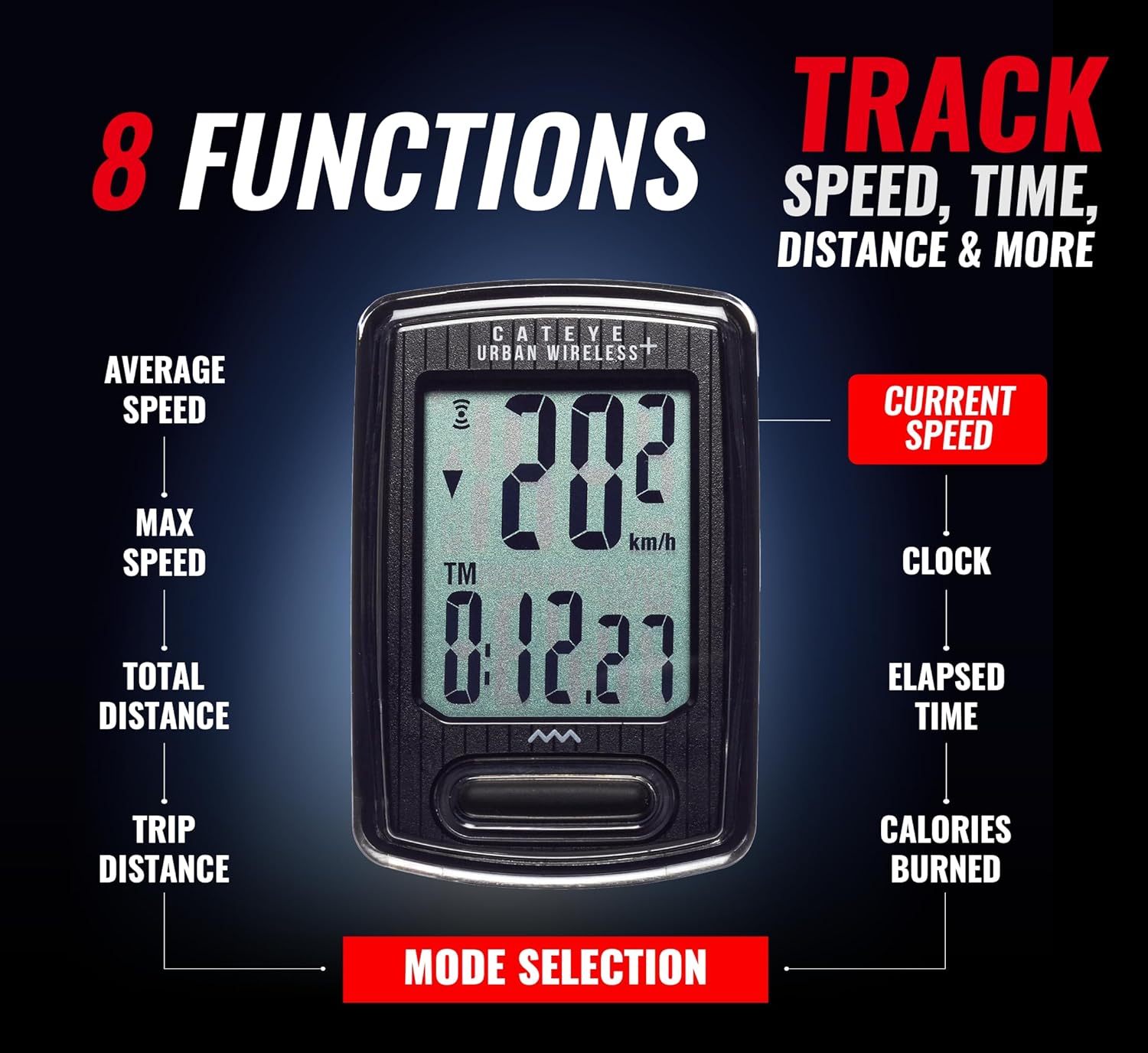 • ALL YOUR FAVORITE STATS: Displays current, max, and average speed, total distance, trip distance, elapsed time, calorie consumption, pace arrow, and clock.