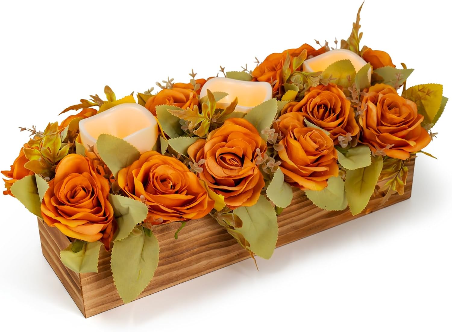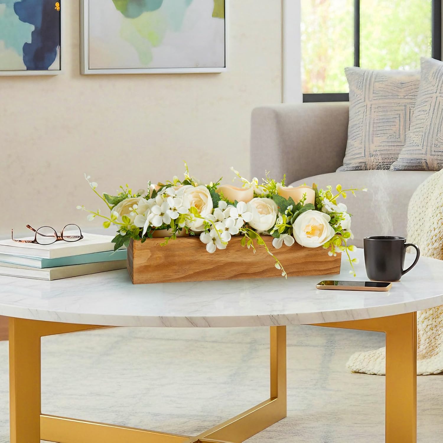 Bring warmth and elegance to your home with this modern farmhouse décor centerpiece featuring three flameless LED candles surrounded by lifelike silk flowers and eucalyptus leaves. The rustic wooden tray design blends classic charm with modern simplicity, creating a stunning dining table centerpiece décor for your kitchen, living room, or entryway. With realistic candle glow, timeless beauty, and effortless maintenance, it’s the perfect table décor for every season or thoughtful gift for any occasion.