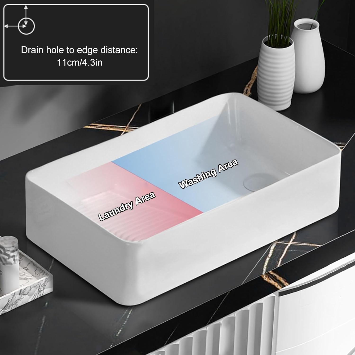 This stylish countertop laundry sink with washboard is designed to enhance any space, featuring a modern square shape and a luxurious marble texture. The refined copper faucet adds a touch of elegance, making it an ideal addition to your bathroom, laundry room, or balcony. Whether you’re washing delicate garments or preparing for a DIY project, this sink provides both functionality and aesthetic appeal, creating a chic and refreshing atmosphere. Constructed from durable ceramic, this laundry sink ensures longevity while maintaining a sleek, white finish that complements various design styles. The rectangular shape is perfect for maximizing space, and the included washboard makes handwashing clothes efficient and convenient. Product Specifications: - Material: Ceramic sink + refined copper faucet - Color: White - Shape: Rectangular - Overflow Hole: Yes - Drain Hole: Yes - Faucet Hole: No - Installation: Countertop - Overall Dimensions: 21.7x15x6.3 in - Faucet Dimensions: 4.3x2x7.9 in Package Contents: - Ceramic laundry sink with washboard × 1 - Refined copper pull-out faucet × 1 - Ceramic bouncing drainer - Angle valve + hot and cold pipes - Fixing screws Transform your laundry and cleaning routine with this versatile and stylish sink. It's not just a sink; it's a statement piece that enhances the functionality and beauty of your home. Experience the perfect blend of modern design and practical utility today!