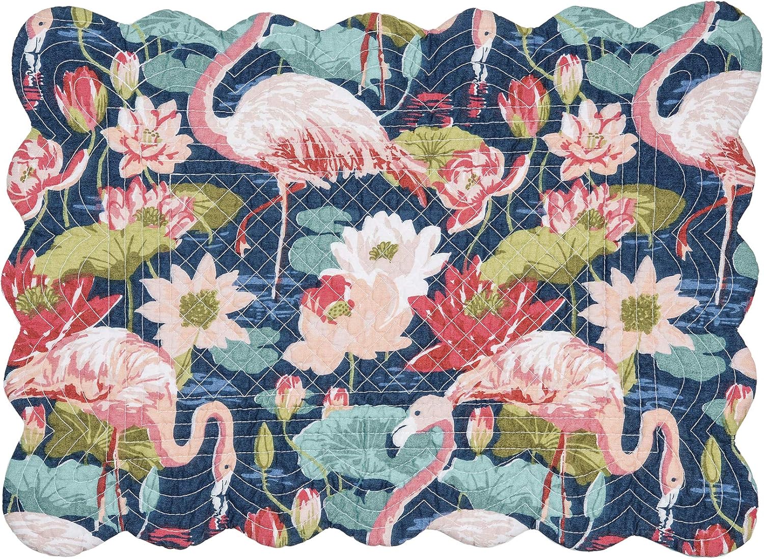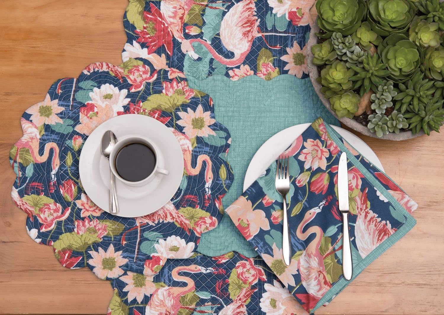 Transform your kitchen or dining room into a personal paradise with the Flamingo Lagoon collection of table linens. A bright and colorful design of painterly-style pink flamingos, tropical florals, and green lilies on a navy blue background makes any day a vacation, and reverses to a more subtle hatched teal design. This quilted cotton placemat is machine washable and perfect for a coastal rental, a Caribbean theme, or a whimsical summer meal.