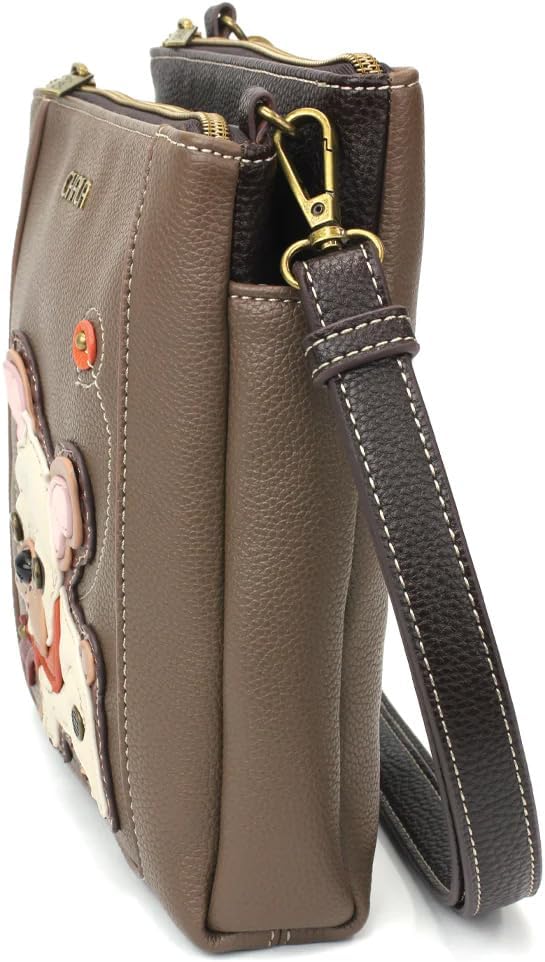 Fun, Practical, RFID Protected Adorned with French Bulldog Chala Pal design Stunning embellishments and embroidery patterns Front zipper pocket with (4) RFID Credit Card Slots Middle magnetic closure pocket Zipper pocket with additional storage compartments Rear slide pocket for small items Crossbody strap is detachable - can be adjusted and worn as a purse or crossbody! Materials: Faux Leather Color: Brown Approx. Measurements: 9"W x 9.5"H x 2"DStrap adjustable: 16.5"-31"Designed in California, USAMade in ChinaColors may not be exactly as shown.Lining patterns may vary.