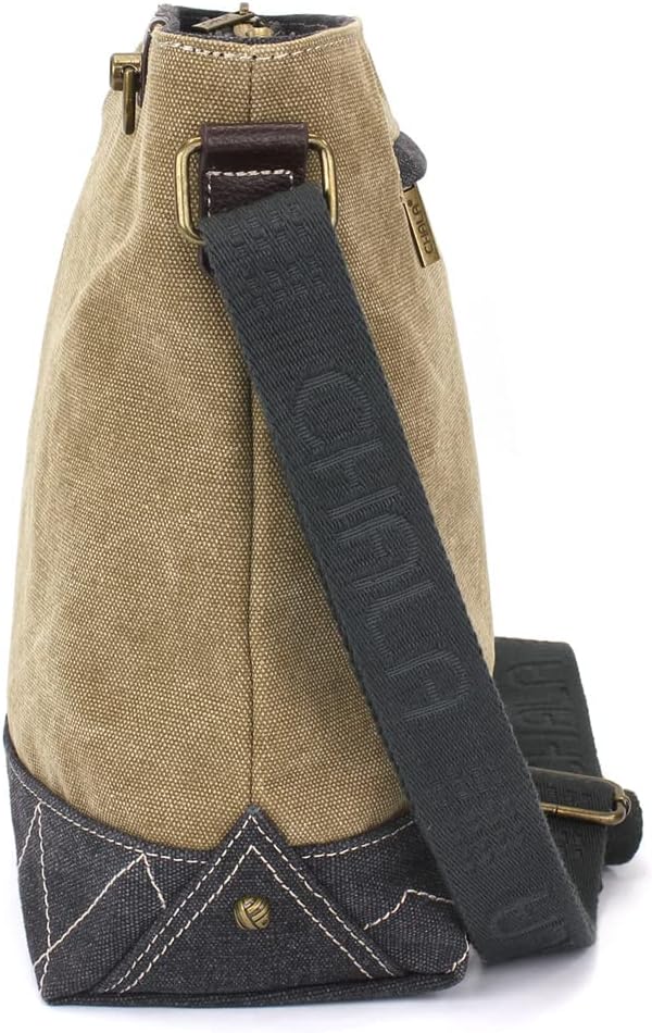 Simple, Durable, Adjustable - Unique geometric stitch patterns. Front slide pocket. Main compartment with additional storage. Rear zipper pocket. Interior brown lining. Adjustable cotton strap. Materials: Canvas | Approx. Measurements: 12 inch x 10.5 inch x 5 inch Strap adjustable: 13 inch - 27 inch | Colors may not be exactly as shown. 1 year manufacturer warranty. Do not machine wash.