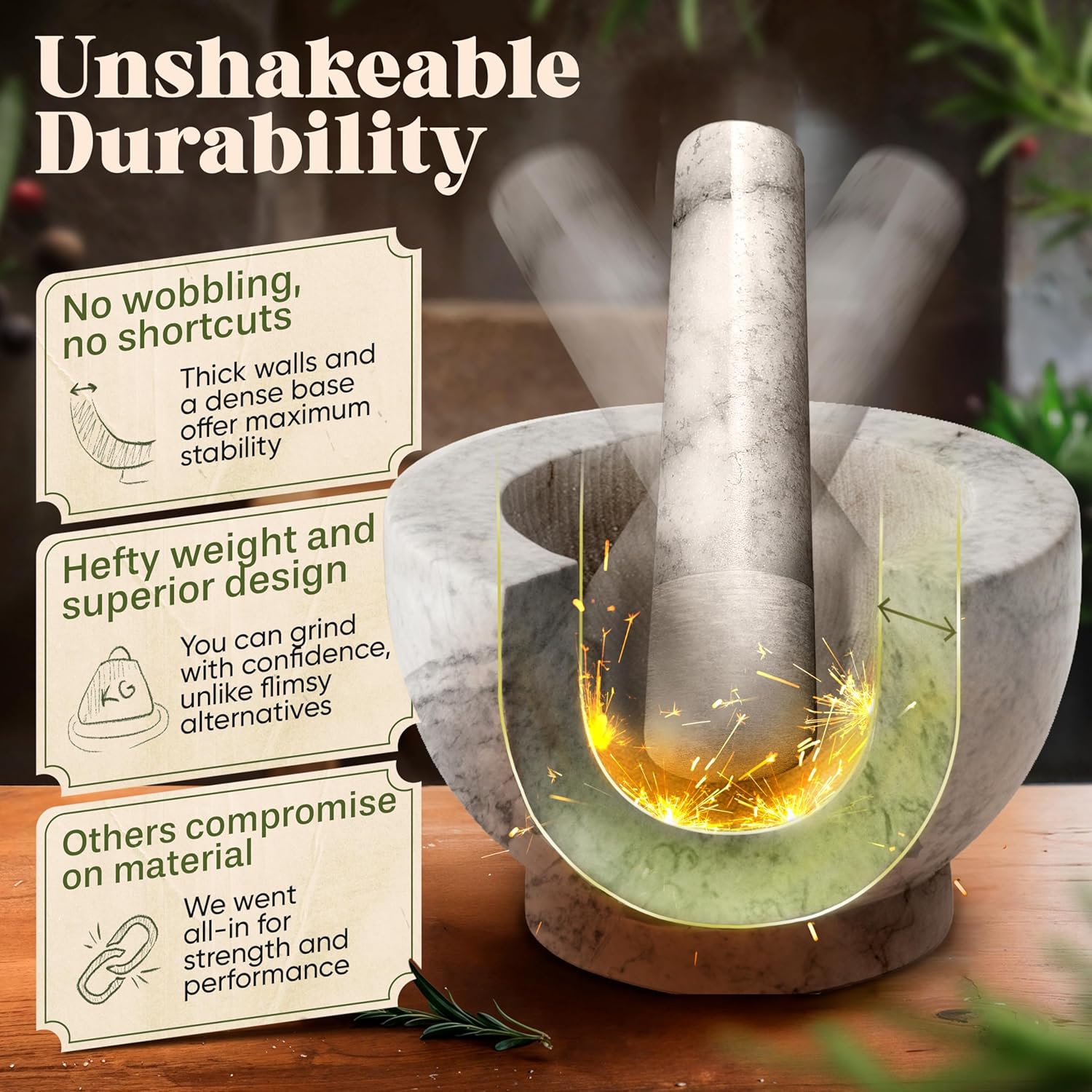 Cook Healthy With ChefSofi Marble Mortar & PestleNo one loves bland food!However, adding store-bought dressings and sauces to your food not only adds up to hundreds of dollars wasted per year, but also jeopardizes your family’s health.Anything stored in cans or jars is laden with chemicals and preservatives. Why deny yourself the gustatory experience and health benefits that come with fresh ingredients?Cooking with ChefSofi’s mortar and pestle will expand your palate, broaden your culinary skills and help you prepare ANY dish, no matter how complex, with incomparable ease!Your New, Kitchen Multifunctional ToolStep into the kitchen with a renewed air of confidence in your cooking abilities. Armed with our mortar and pestle, you now can:o Grind seeds, nuts, plant roots into easily digestible pieceso Crush fresh spices or herbs into small particles and release their natural oilso Perfect your homemade salad dressing, dip, seasoning and condiment recipes o Combine ingredients to make ketchup, mustard, or fish sauceo Pulverize fruit for smooth-textured baby foodo Powder pills for improved intakeWe are just certain that you will LOVE using our Mortar & Pestle Set, which is why we are offering you an iron-clad100% 2YEAR MONEY-BACK GUARANTEE!Be Prepared!Once your Amazon package arrives, take out your mortar. Add some warm water in its cup and carefully remove any residual marble particles. Season it with white rice, followed by some cumin, garlic, salt and pepper and rinse it thoroughly, allowing it to air dry.You’re Now Ready To Start Cooking!Click Add To Cart Now As We Run Out Of Stock, Fast!