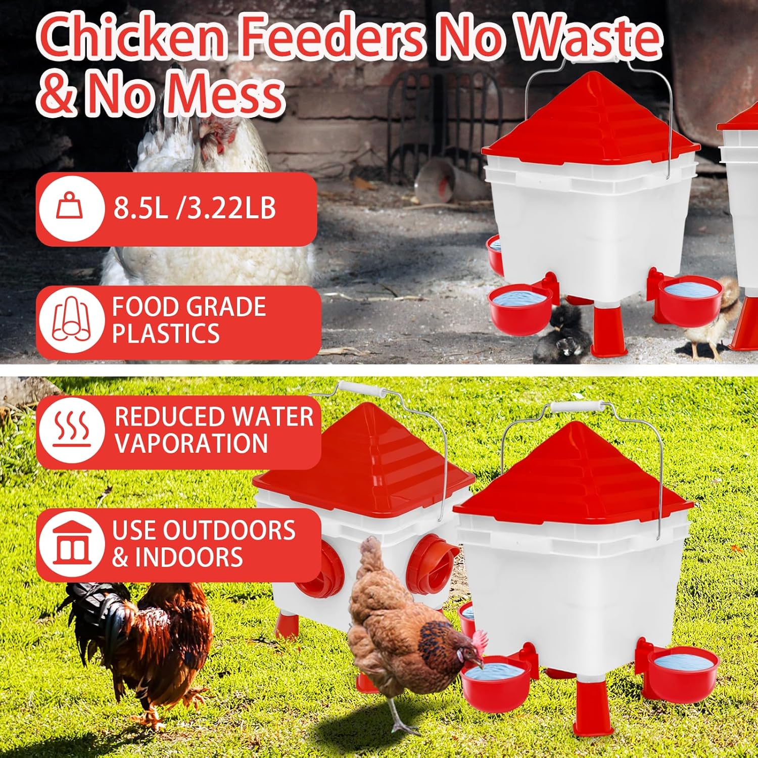 | Additional Features | Automatic Feeding, Complete Chicken Feeding Kit, Gravity Refill System, No Waste Feeding, Rainproof Feed Lid |