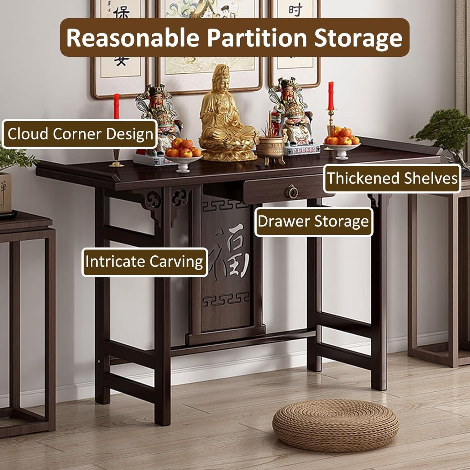 Chinese Buddhist Altar Table Temple Altar Table Bamboo Buddhist Offering Niche Guanyin God of Wealth Shrine CabinetIn our fast-paced lives, this Shrine Altar Table creates a peaceful sanctuary. Use it as a Meditation Table with drawers to store sacred items and enjoy a calm, reflective spaceThis Shrine Altar Table features smart partitioned storage with drawers, making it easy to organize items. It functions beautifully as a Meditation Table or Buddhist Meditation CabinetCompact yet efficient, this Meditation Altar Cabinet saves space while offering versatile storage for tea sets, books, or decorative piecesBuilt with strong weight capacity, this Chinese Buddhist Temple Table can hold heavier items securely, ensuring both practicality and reliabilityProduct SpecificationsProduct Name: Chinese Buddhist CabinetDimensions: 80x30x80cm/31.5x11.81x31.5inColor: Dark BrownMaterial: WoodInstallation: AssembledUse: Suitable for ancestral halls, temples, sacrifices, incense burning, divination, commemoration ceremonies, and various other rituals.Suitable for both formal and casual settingsSuitable Locations: Living rooms, bedrooms, balconies, shrines, ancestral halls, and templesPackage Includes: 1 altar tableNote:This product only includes the altar table; other Buddhist statues and other decorative items are not included.Due to manual measurement, slight discrepancies of 0-3 cm may occur. Please confirm the dimensions before purchasing.