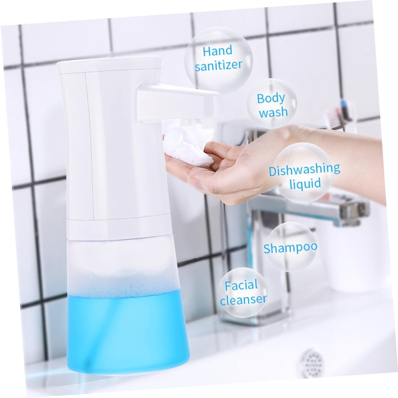 Package List 1 x Soap Dispenser Characteristics - Size: About 11.5 x 7.9 x 19.3cm Soap Dispenser. - Capacity: 350ml Automatic Soap Dispenser. - Material: Plastic. - Color: White. - You don't have to worry about the damage by liquid seeping into the dispenser through the button Soap Pump. - Large capacity, very for home use Touchless Soap Dispenser. - Remove the soap tank from the bottom to refill Auto-Induction Sensor Soap Dispenser. - Made of plastic material, more and solid. Powered by 4 AAA batteries(not included). - Touchless and easy to set up. Put your hand under the sensor to let the dispenser start to work.Goods DescriptionSoap Dispenser The touchless soap dispenser is automatic, don't have to touch the pump to use soap.Soap Pump Electronic sensors promote as you are not at risk of that might be on the surface of the dispenser.Automatic Soap Dispenser Suitable for bathroom, kitchen, toilet, office, hotel, etc