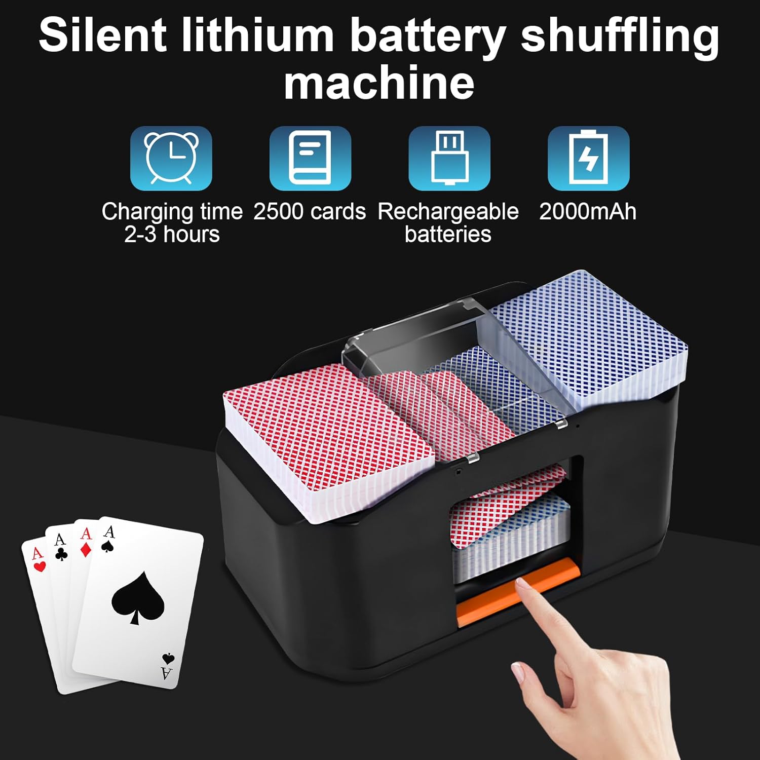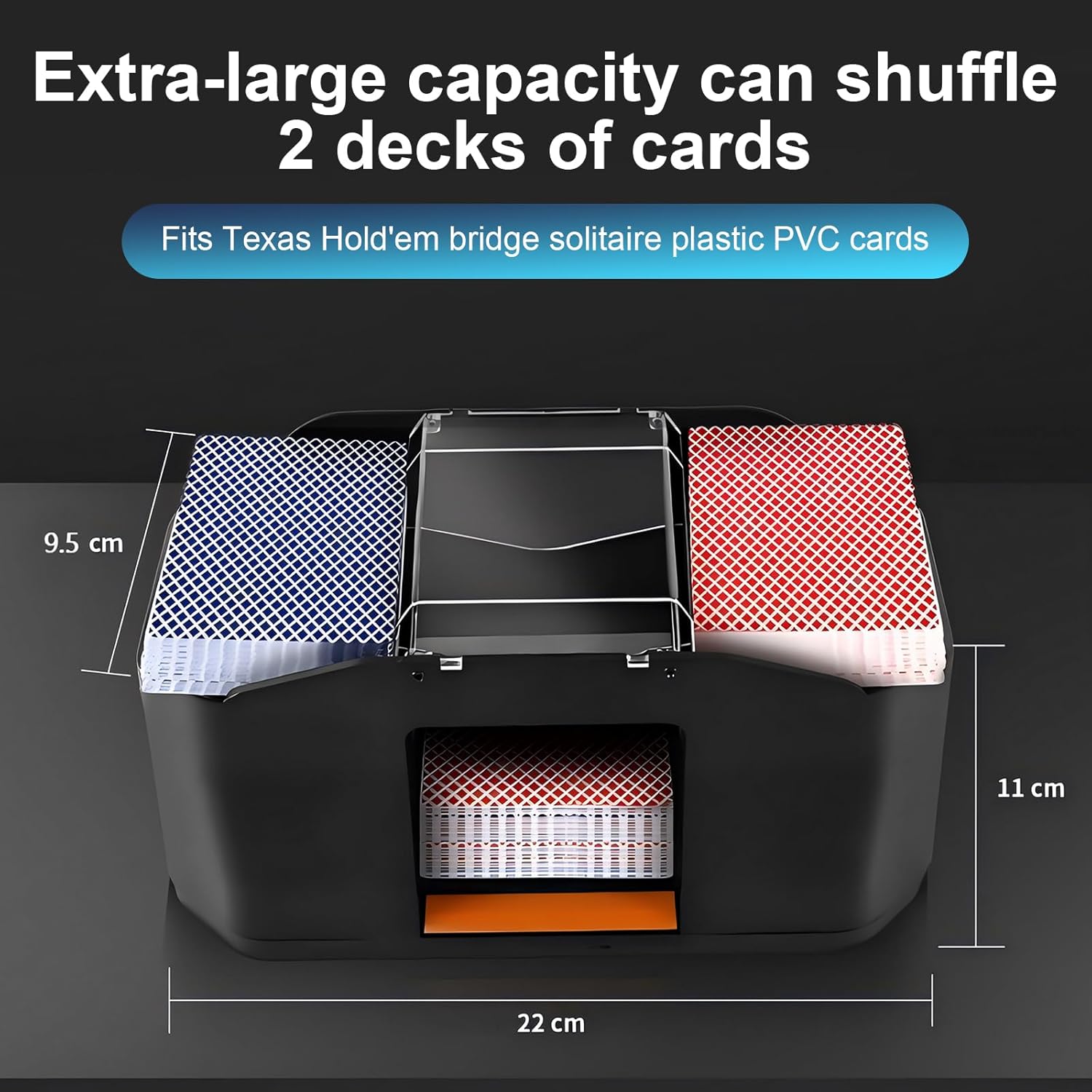 Introducing the cjc 2 Decks Automatic Card Shuffler with 2000mAh Rechargeable Battery. Perfect for enthusiasts of card games such as Texas Hold'em and Blackjack, this quiet, efficient shuffler ensures your gaming experience is smooth and uninterrupted. Don't miss out on hassle-free shuffling with our advanced motor design.