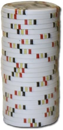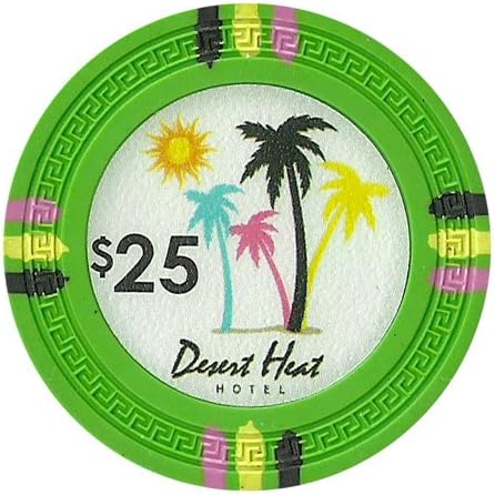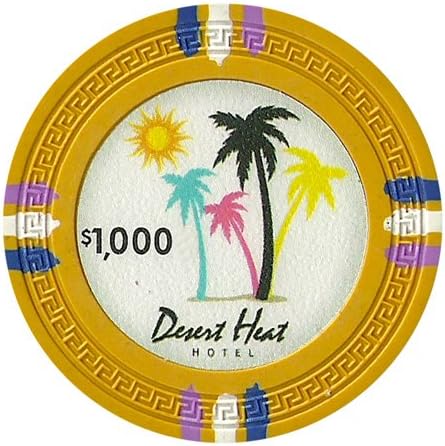 These are the new "DESERT HEAT" clay composite poker chips from Claysmith Gaming. Claysmith offers true casino quality poker chips for the home player. This is the Desert Heat poker chip design. The Desert Heat inlay is set upon a Claysmith Gaming Greek Key molded poker chip. The Desert Heat has twelve thin stripes in bunches of three for its edge markings. The layout of this poker chip is similar to the very popular Mirage poker room casino chip. The Desert Heat inlay uses the sun and vividly colored palm trees to convey its warm desert theme. The denomination is well placed and easy to read on the left hand side of the inlay. The fictitious casino destination "Desert Heat Hotel" is written along the underside. Claysmith Gaming is synonymous with poker quality. Claysmith brings casino aestheticism with fresh new designs to your home game. Claysmith poker chips feel and look substantial, which enhances your playing experience. Most home use poker chips are just a component of the game. Claysmith chips are a part of the enjoyment of the game. Players are excited when they hear that you will be playing with Claysmith chips in your poker game. You will be proud when you set them on your table. These chips are available in 12 different denominations: $0.25 cents, $0.50 cents, $1, $5, $10, $25, $50, $100, $500, $1000, $5000, & $10,000. NOTE: YOU WILL RECEIVE 500 NEW CHIPS PER ORDER (NO CASE). PLEASE CHOOSE CHIPS VIA EMAIL IN MULTIPLES OF 25 AFTER PURCHASE. SUBJECT TO AVAILABILITY.