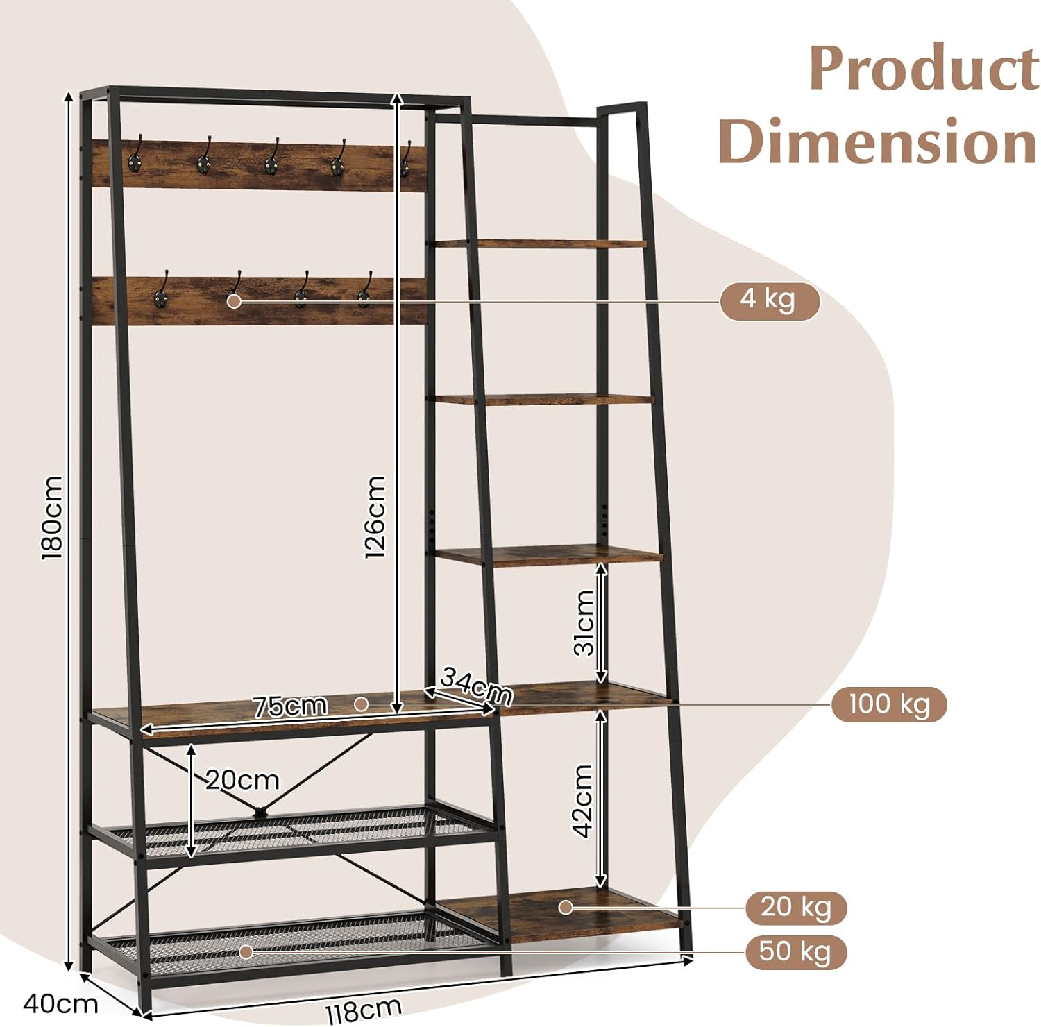 Choose CASART clothes rail, make your life easier. Heavy-duty metal frame ensures durability and sturdiness Simple yet elegant design makes it ideal for entryway, bedroom and other places Multi-layer storage can farewell to disorder, like messy clothes, or shoes in disorder Feature: Safe anti-toppling devices for firm attachment to the wall The design of benches makes it easier for you to wear shoes Add a touch of beauty and blend perfectly with most home decor Sturdy trapezoidal design with x-shape support & tight connection for stability Multifunctional entryway coat rack with 5-in-1 design provides large storage space Specification: Net Weight: 24kg Color: Black+Rustic Brown Materials: Engineered Wood, Metal Weight Capacity of Each Hook: 4kg Weight Capacity of Shoe Bench: 100kg Weight Capacity of Each Mesh Shelf: 50kg Weight Capacity of Each Wooden Shelf: 20kg Size of Shoe Bench: 75 x 34cm (W x H) Product Dimension: 118 x 40 x 180cm (L x W x H) Clearance between Wooden Boards: 31/42cm Clearance between Shoe Bench and Top: 126cm Clearance between Mesh Shelf and Shoe Bench: 20cm Package included: 1 x Hall Tree, 1 x User's Manual Attention: We are so sorry that our couriers service cannot ship to the following areas: Channel Islands (such as Jersey and Guernsey), Lerwick, Outer Hebrides, Isle of Man, Scilly Isles, Scottish Island, PO Box. If you want to return our items, plz make sure that it's in original packaging and authorized by us. Plz do not ship any products to any places without our authorization since it may lead to unsuccessful return.