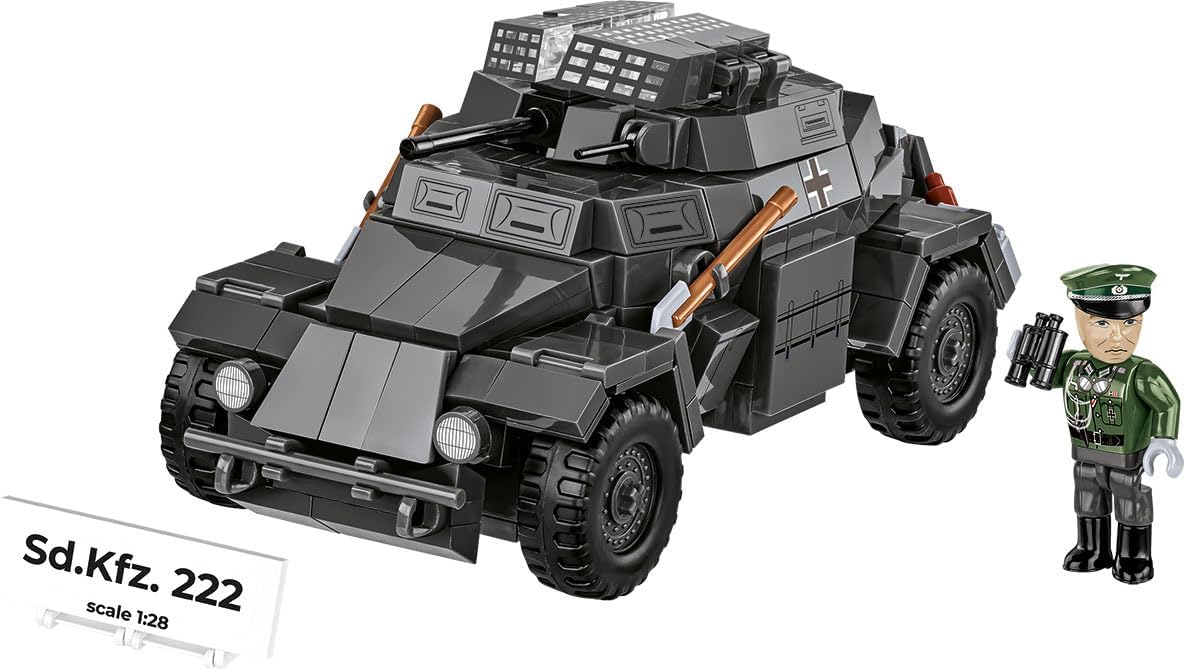 Build the SD.KFZ. 222 model from COBI - a light armored reconnaissance vehicle! The SD.KFZ. 222 is one of the most recognizable German vehicles from World War II, an important element of the Wehrmacht's reconnaissance forces. Thanks to its light armor and high mobility, the SD.KFZ. 222 was mainly used for reconnaissance, patrolling and infantry support on various war fronts. Lightweight, solid construction: The SD.KFZ. 222 vehicle was equipped with a rotating turret with a 20mm gun, which gave it a significant advantage in combat. The front and sides of the vehicles were protected by 8mm thick steel sheets: thinner, 5mm of sheet metal protected the top, rear and chassis. The turret was not armored from above, the crew was protected from this side only by a protective net against grenades and light shrapnel. With a maximum speed of 80 km/h and four-wheel drive, this vehicle was excellent for off-road maneuvers. Although its armor was modest, it provided basic protection for the crew. Mainly used by reconnaissance units, the SD.KFZ. 222 played a key role in German operations on various fronts of World War II. SD.KFZ. 222 Model - Precise Reconstruction - Build this excellent model that faithfully reproduces the design of the SD.KFZ. 222 vehicle. With photo-realistic elements, precise details and reproduction of characteristic features such as the rotating turret and armor, it can be part of a unique diorama from World War II. Why choose the SD.KFZ. 222?Historical precision: The model faithfully reproduces the appearance of the SD.KFZ. 222 vehicle, which allows you to create realistic scenes from the times of World War II.Figure included: The set includes a figure of a German lieutenant with binoculars, which increases the possibility of interactive play and using the model in dioramas.Movable elements: The opening turret allows you to place the figure in the vehicle, which allows for even more realistic use of the model.Mobile when needed: Thanks to the rubber, rotating wheels, the model works great both as a moving toy and as a realistic element of a diorama.Instructions: Clear and detailed instructions with illustrations will help you easily build the model, offering fun while learning about history.Fun and learning: Building the vehicle from 502 elements is a great opportunity to learn about the technical aspects of the construction and the history of the SD.KFZ. 222.Scale 1:28: Thanks to its dimensions, the model is ideal for both younger and older enthusiasts of history and building with blocks. It is also a great complement to other models from the WWII series in the same scale. A combination of passion and fun. Build and discover the history of World War II and enjoy the realism provided by the SD.KFZ. 222 model. Whether you are an experienced modeler or just starting your adventure with blocks, this model will provide you with a lot of satisfaction and joy from discovering the past.