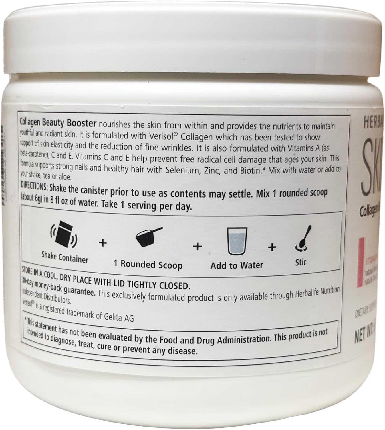 Nutre tu piel desde el interior para una piel más joven y radiante. Este suplemento está disponible en sabor limonada de fresa. Elaborado con colágeno Verisol*, el cual se ha comprobado que favorece la elasticidad de la piel y la reducción de las arrugas finas. El colágeno proporciona a la dermis (la capa interna y más densa de piel) su estructura firme. Con el paso del tiempo, la producción del colágeno en nuestro cuerpo disminuye y como resultado, perdemos firmeza y elasticidad, lo cual genera arrugas en la piel. Colágeno Potenciador de Belleza Herbalife SKIN nutre la piel desde el interior y brinda los nutrientes necesarios para una piel joven y radiante.