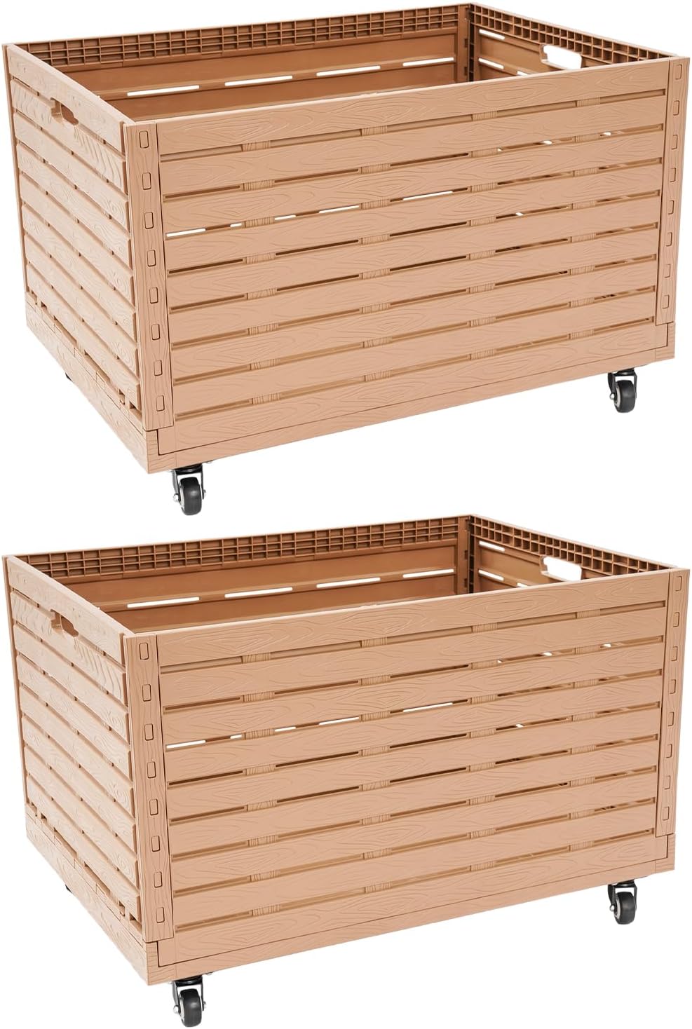 Description:This storage bin combines style and functionality.The realistic wood-texture gives it a na-tural, elegant look, while the spacious capacity provides ample room for your belongings.Equipped with durable wheels, it is easy to move around,making it great for organizing and moving various items like office supplies, furniture, boxes, and parcels.It is your great helper for moving and storage.Features:Elegant Appearance: Imitation wood grain color, grille design, and rectangular shape make this product beautiful, practical, and elegant, suitable for most usage scenarios.Practical Gift: Thanks to its powerful functions and exquisite appearance, you can give this product as a gift to people engaged in home renovation work, salespeople, and handymen.Enjoy Fun of Assembly: This product has a simple structure and is very easy to assemble. You can enjoy the joy of successful assembly and quickly start using it.Easy Clean-up: With its simple construction and smooth surface, you can simply wipe off surface dust with a damp rag (not included).Details:Large Opening: The large rectangular opening makes it easy to store and access your items.Concealed Handles: The handles on both sides make it easier for you to carry, reduce hand pressure, and provide better grip points.Smooth Edges: They can protect your hands from being scratched during installation and cleaning and also improve the texture of the product.Application:This product can be used to easily move suitcases, cardboard boxes, groceries, water bottles, balls, yoga mats, etc. It is suitable for garages, supermarkets, factories, markets, workshops, and other locations.Folding Steps:1. Push open the buckle.2. Lower the long boards.3. Lower the short boards.4. Folding is completed.Specifications:Material: PPProcess: Injection MoldingColor: Imitation Wood Grain ColorShape: RectangularStyle: ModernAssembly Required: YesMounting Type: Floor StandingNumber of Universal Wheels: 5Each Capacity: 200L/52.83GalLoad Capacity: About 200 kg/440.92lbsNumber of Items: 2Folded Size: 82*60*8cm/32.28*23.62*3.15inUnfolded Inner Product Size: 79*57*44cm/31.1*22.44*17.32inUnfolded Outer Product Size: 82*46*60cm/32.28*18.11*23.62inPackage Size: 90*62*17cm/35.43*24.41*6.69inGross Weight: 14.5kg/31.97lbsNet Weight: 13.78kg/30.38lbsPackage Included:2* Foldable Storage Bins5* Universal WheelsOther Accessories for AssemblyNotes:1.Please carefully check the dimensions before purchasing.2.Please note that other storage objects are not included.