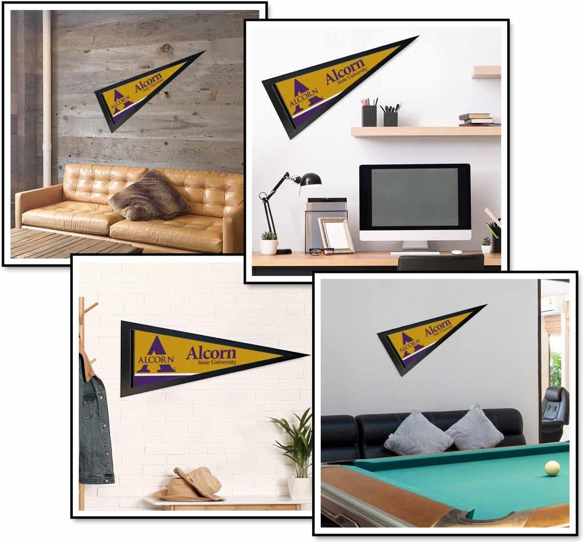 Alcorn State Pennant Pennant and Wood Pennant Frame includes a 12x30 inch soft poly felt Officially Licensed pennant and the recommended Pennant Frame which is made of solid poplar wood.The pennant is full size, single sided screen printed, and is ideal to display on any wall of your home, office, gameroom, or as a banner. The Pennant Frame is 13.25 x 34.25 inches, made of poplar wood moulding, stained black satin, includes a plexiglass front, and fits this pennant perfectly. Please Note: The pennant frame has a protective plastic film on both sides of the plexiglass. Please peel off from both sides when ready to use.