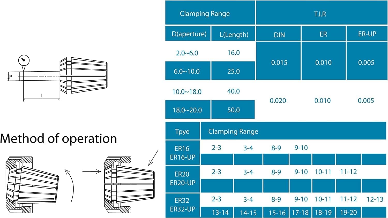 K-Gualda Collet Chuck Hand MT3-ER32 M12 Material: SCN21: ER32 collet chuck set (18 pieces) Taper angle is ideal 8° Adopts a self-release type with the eccentric ring of collet grooves and clamping nuts, making it easy to remove tools without the use of a collet removal tool. Material: High carbon chrome bearing steel (SUJ2 material) Clamping Range is 0.015 T.I.R (0.08 - 0.79 - 0.8 inches (2 - 3 - 19 - 20 mm)