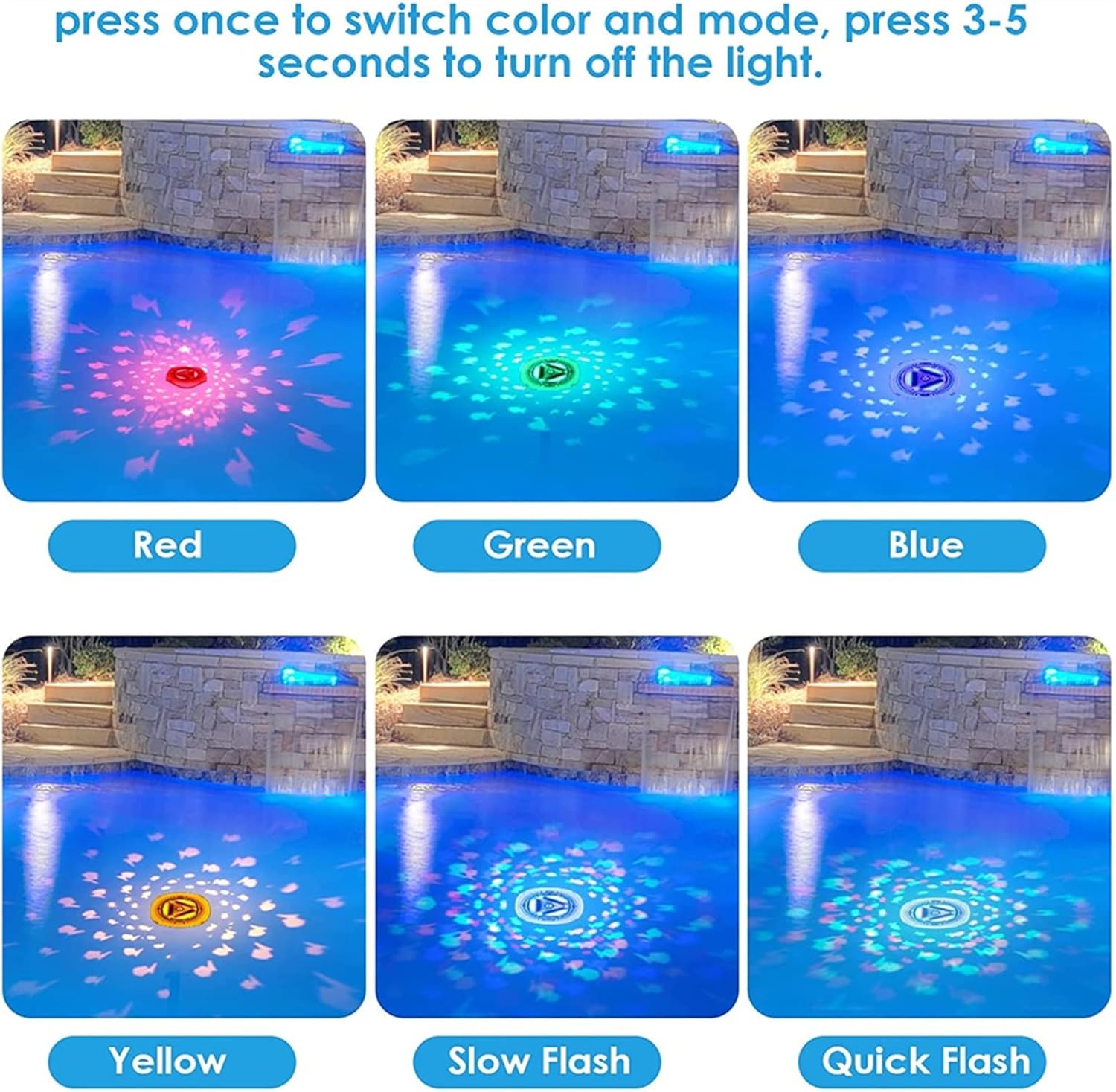 Pond LightsColorful Floating Underwater Swim Pool Lights Battery Operaed Submersible Light Bath Kids Pool Toy Light Pond Fountain ProjectorDescription:This LED swimming pool light can project cute little fish light and shadow.Precise design make pool lights floating on the water surface and give out light underwater. The fish-shaped holes on swimming pool light shell make lighting look like lots of fish swimming in the water.Including red, green, blue, yellow and static and dynamicmodes.After install three AAA batteries, then tighten the cover to prevent water leakage, lightly press the switches on the cover to enter the light-on mode, and press the switches to enter different modes.Specification:Material: ABS.Type of Bulb: LEDPool Light Color: red green blue yellowUnderwater Light Mode:static and dynamicLight type: 4 SMD2835Light distribution: 4 red, green, blue, yellow evenly distributedLighting mode: static and dynamic, a total of 5 color testProduct size: 12.3*12.3*8.5CMPower supply mode: 3 AAA (battery not included)Packing List:1x LED Swimming Pool Light (Battery Not Included)1x Screwdriver1x Manual