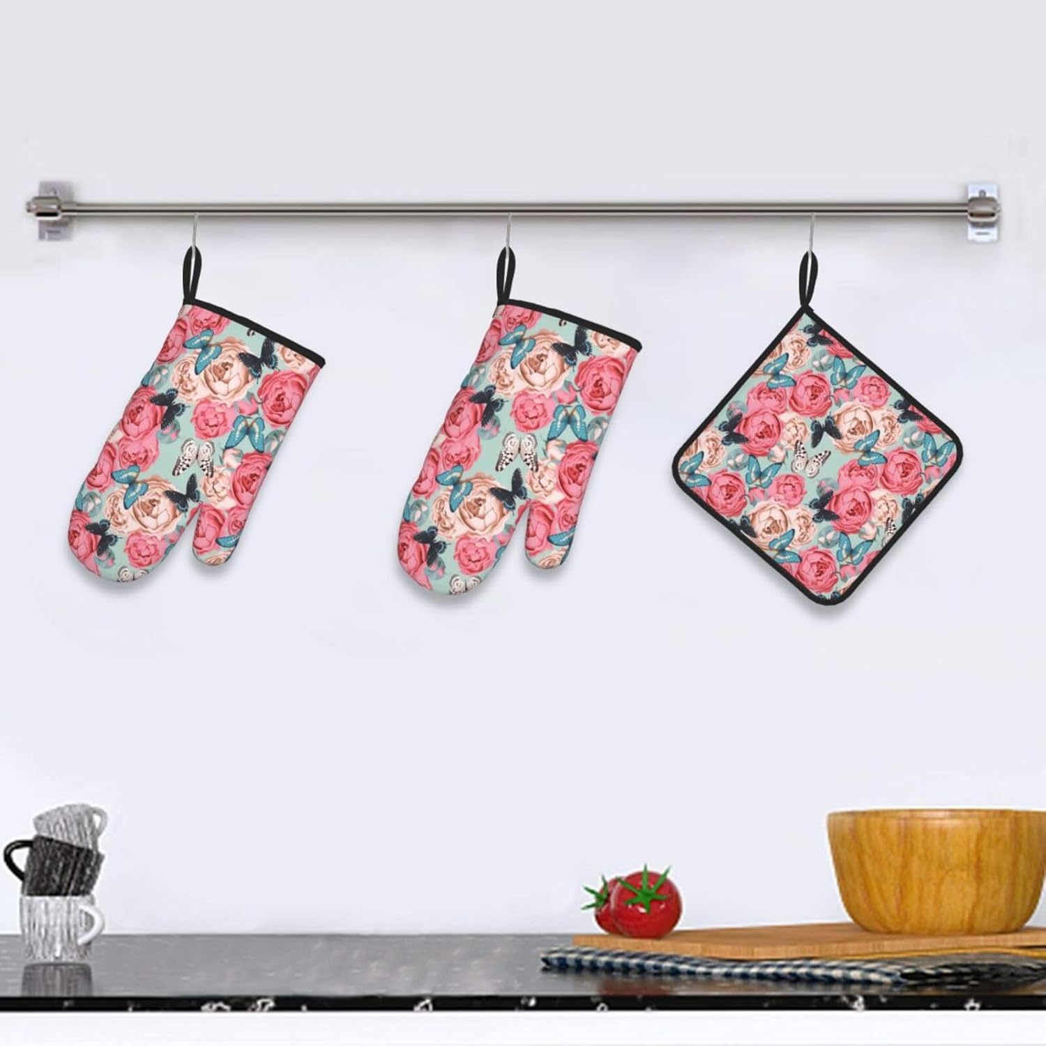 upgrade your kitchen safety with this Colorful Flowers print microwave gloves, oven mitts and pot holders sets. crafted from water repellency polyester and heat-resistant fabric, these kitchen baking three piece set offers reliable protection for hands while handling hot items. the double-layer waterproof design ensures easy cleaning after use. suitable for various cooking scenarios including microwave ovens, conventional ovens, stovetop cooking, and outdoor grilling. the side hanging rope allows convenient storage when not in use. the thick construction provides excellent heat insulation without compromising dexterity. this unisex kitchen essential combines functionality with practical design for everyday cooking needs. the heat-resistant gloves maintain comfort while offering superior protection against burns. an essential addition to any modern kitchen setup