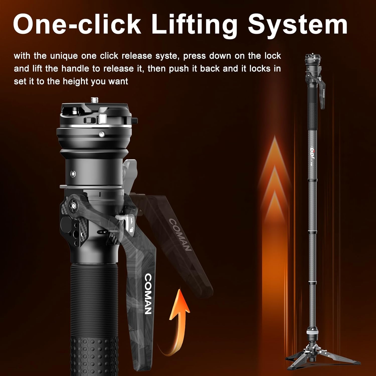 | Features | Detachable Base, Four-Section Carbon Fiber Tube, Lightweight, One Click Lifting Syestem, Quick Release Device |