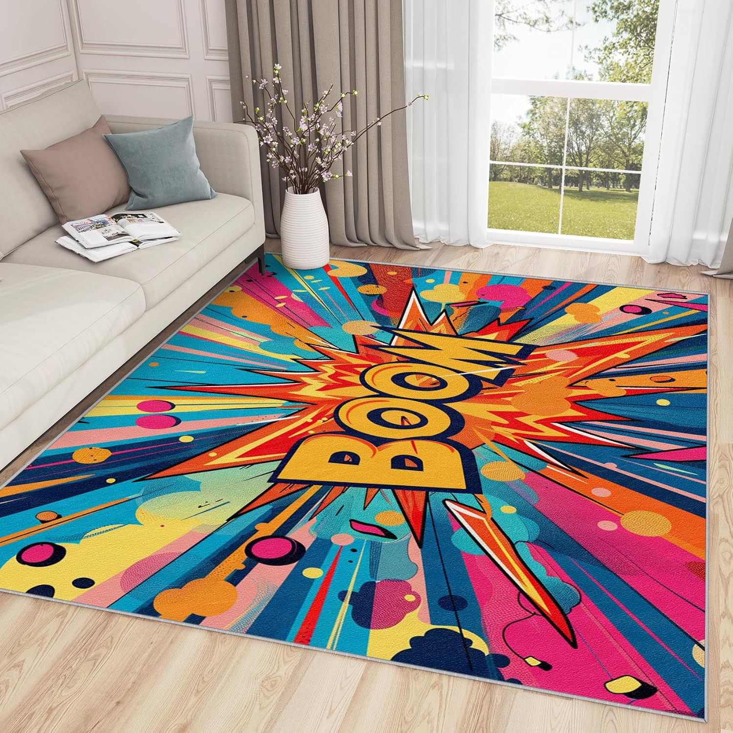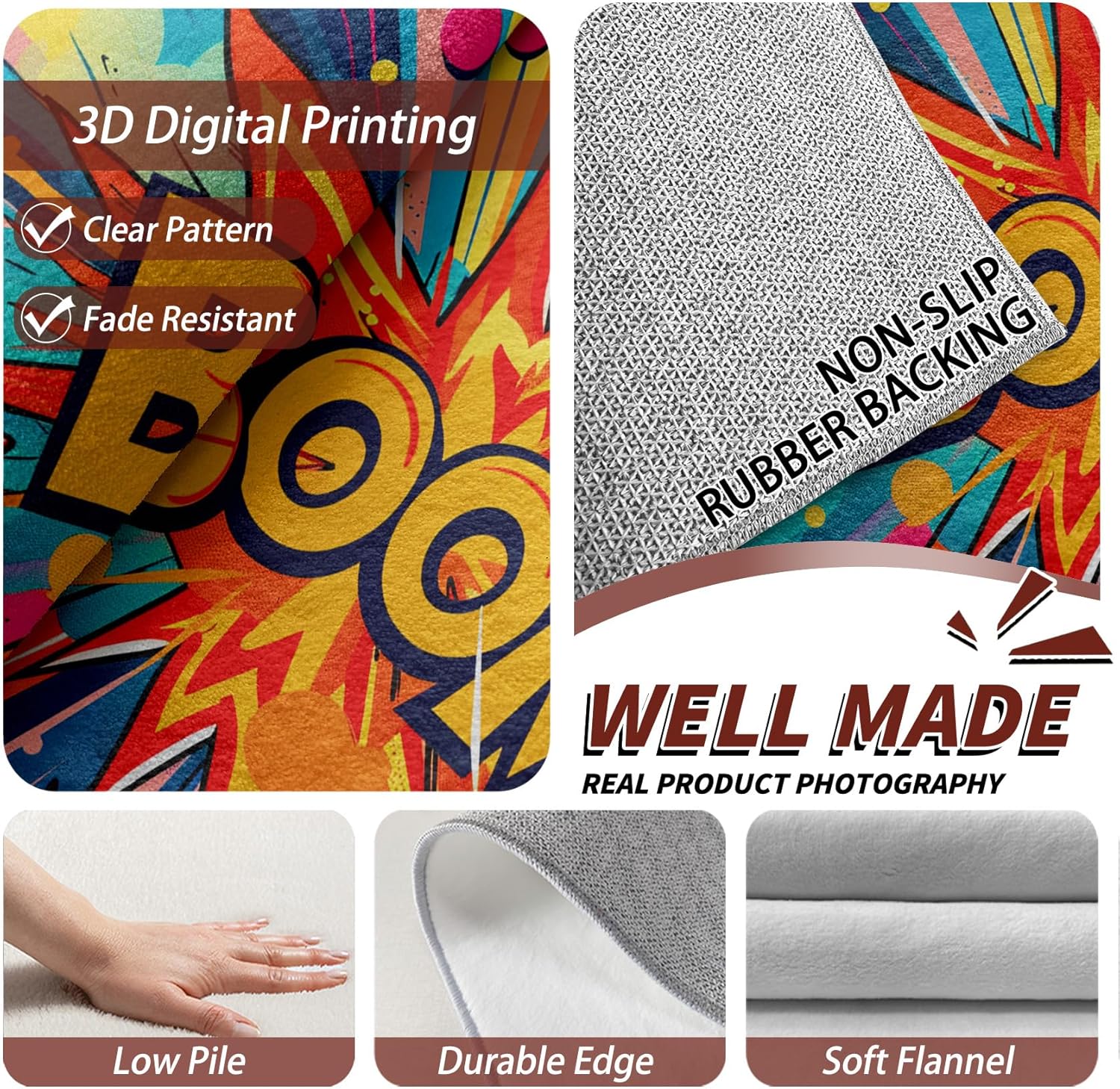 Comic Book Rug & Home Decorations 3x4 area rug / 90x120 cm Features Super Soft Area Rug Ultra soft and luxury to the touch, this lightweight floor carpet is made from skin-friendly, safe and kid friendly materials to pamper and relax your feet Upgraded Non-slip Bottom This alfombras feature a dense and durable TPR rubber backing that help increase friction with the floor and prevent sliding Room Decor Say goodbye to boring plain carpet and decorate your room with this excellent printed alfombra Perfect for livingroom, bedrooms, classroom, guest room, hallway, home office, kitchen, laundry room, study room and so on Well Made This machine made rug is tightly woven and has neat edge, making it more durable Our carpet adopts advanced 3d digital printing technology with clear pattern, high color fastness and no fading Pet Friendly Cats and dogs will also love this comfortable area rug because of the quality fabric choice Easy To Clean For partial cleaning, just wipe with a damp cloth or low frequency vacuuming For Integral cleaning, we recommend that you machine wash / hand wash it with room temperature water, then air dry Customer Service If you have any questions about our products, please feel free to contact us, we have professional customer service staff to serve you