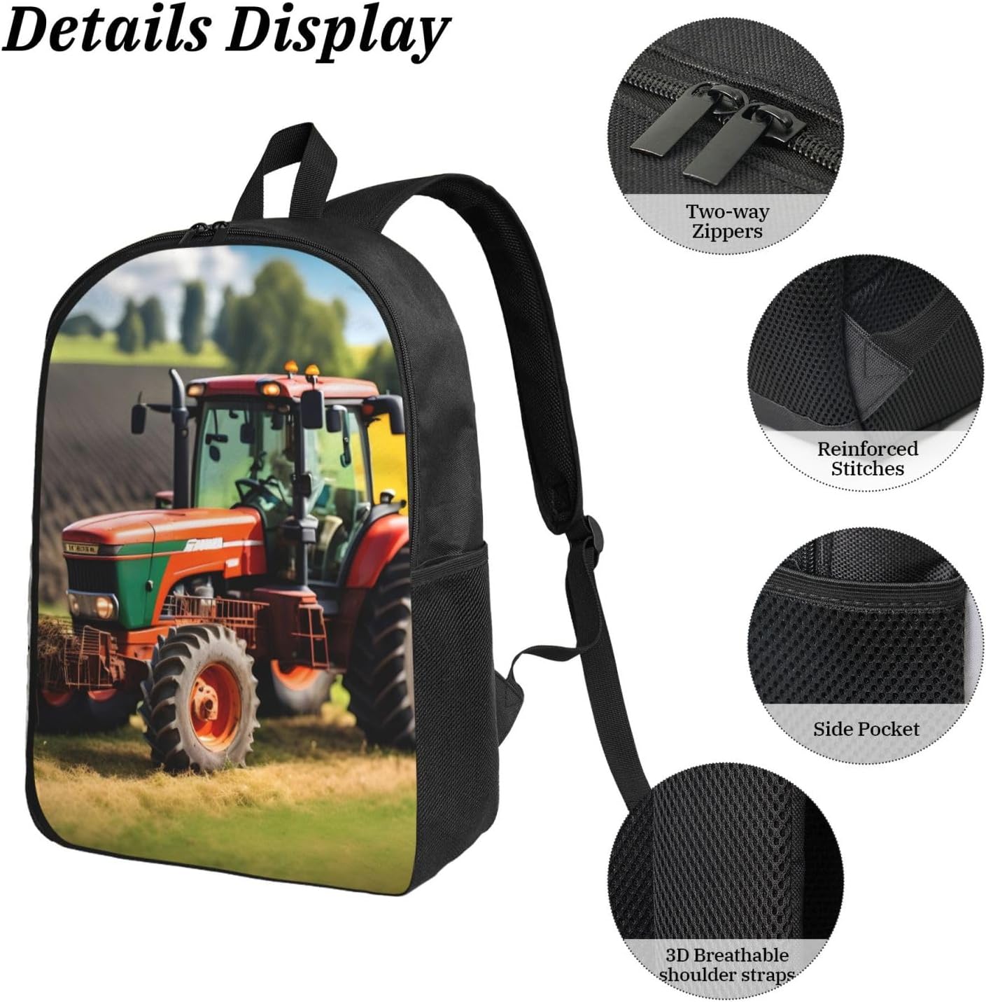 The Company Farm Tractors print Backpack with Lunch Bag, Pencil Case is made from robust Oxford fabric that provides a reliable and long-lasting performance for anyone who values functionality. The dimensions of the backpack (12.6x5.1x17 inches) allow for comfortable storage of your essentials, while the lunch bag keeps your food at the right temperature, perfect for day trips or outdoor activities. The pencil case offers a tidy solution for your writing materials, completing the set with added practicality and style for a variety of uses, from hikes to daily errands.