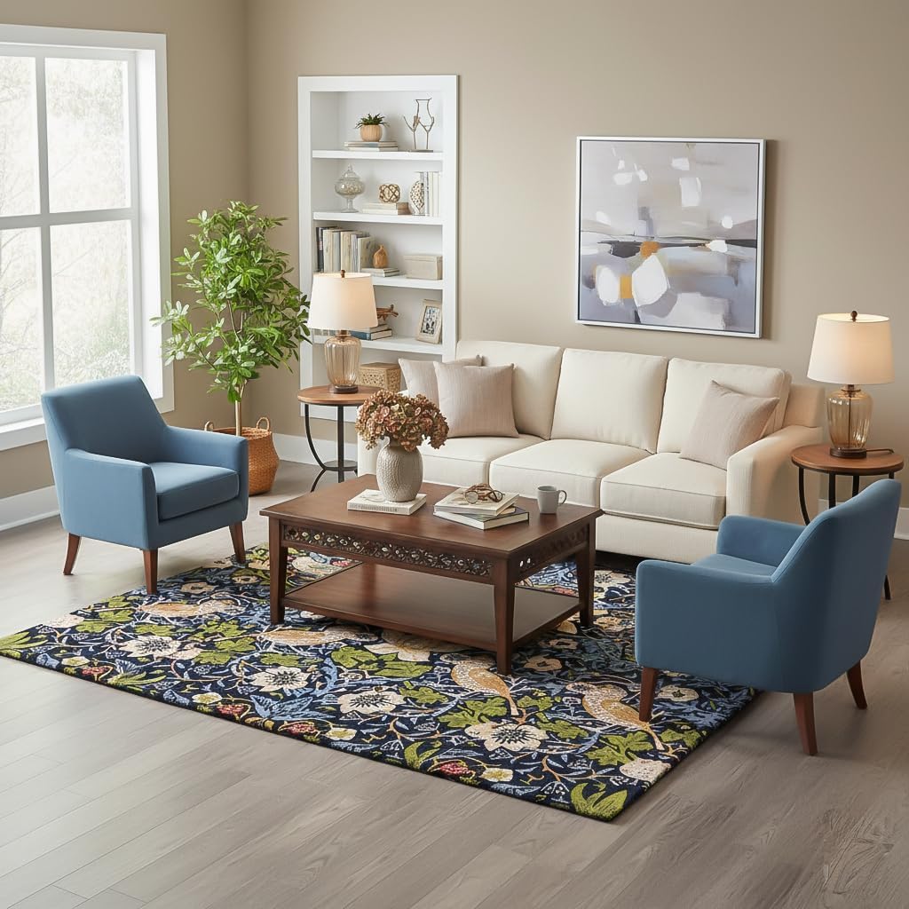 Restoration & Renovation Strawberry Handmade Wool Area RugEnhance your home with the timeless craftsmanship of the Restoration & Renovation Strawberry Wool Area Rug. Hand-tufted by skilled artisans in India, this rug showcases a detailed Strawberry Thief-inspired design, blending elegant floral and botanical motifs. The rich, vibrant colors and classic pattern create a beautiful balance between traditional charm and modern sophistication, making it a versatile addition to any space.Key Features:Nature-Inspired Design: Features intricate florals and botanical elements in a classic Strawberry Thief pattern, offering a nature-inspired aesthetic for living rooms, bedrooms, and more.100% Premium Wool: Expertly hand-tufted from finest wool, providing a soft, plush feel underfoot along with durability and minimal shedding.Rich Color Palette: Designed with deep, inviting tones that add warmth, depth, and artistic flair to any interior décor style.Durable Craftsmanship: Built to withstand everyday use, offering a lasting centerpiece that combines beauty and functionality for high-traffic areas.Care Instructions:Regular Maintenance: Vacuum regularly using a suction-only vacuum or a vacuum without a beater bar to maintain the rug’s fibers and texture.Spot Cleaning: Blot spills with a clean, dry cloth. Avoid rubbing to preserve the rug’s appearance and quality.Professional Cleaning Recommended: Periodic professional cleaning is advised to maintain the rug’s luxurious look and feel over time.The Restoration & Renovation Strawberry Wool Area Rug offers a perfect blend of artistic design and enduring quality, bringing a sophisticated and welcoming touch to your home décor.