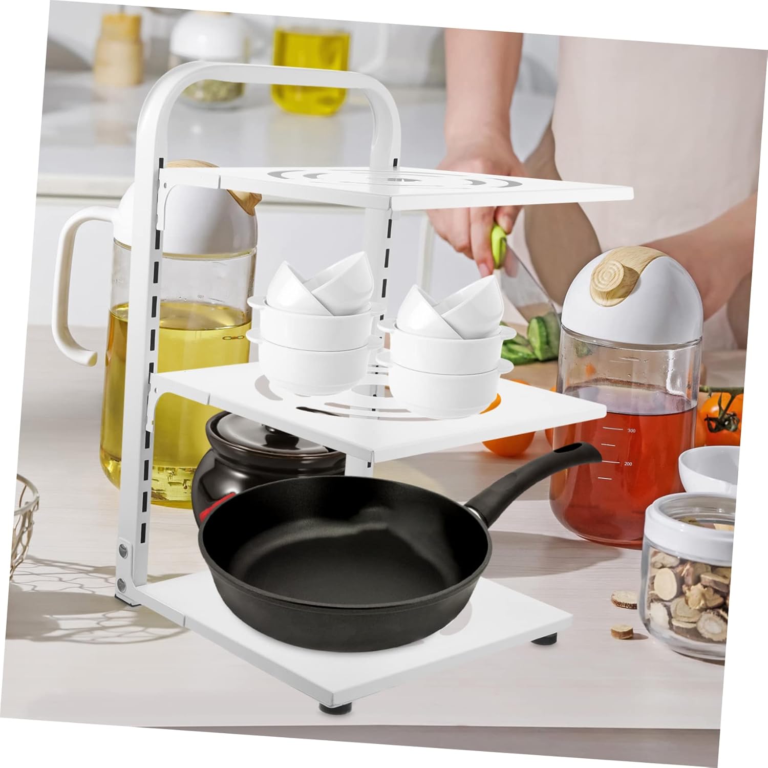 Package List 1 × Pot Organizer Rack Features - Size: 27.00X24.00X41.00cm/10.61X9.43X16.11in multi-function pan organizer - Color: White countertop pan organizer -Material:Carbon steel household pot rack -Multipurpose, not only as a cabinet pot storage rack, it also can be used as a countertop spice bottle holder rack adjustable pots organizer. -Household Pan Organizer is adjustable, which makes it suitable for most sizes and shapes of pots kitchen supply. -Multi-functional, the storage rack is suitable for steam pot, saucepan and pan with various thickness multi-layer pan organizer. -Multi-layer design storage shelf, convenient and compact, space-saving, can make full use of the kitchen vertical space adjustable pot organizer. -The rack is designed with strong stability, to break, and desktop pan organizer.Goods Descriptiondesktop pan rack The adjustable layer design allows you to the location of each layer according to the height of your pan and pot.home accessory The storage rack is widely used in holding pot, frying pan and steam pot, but also storage your spice bottles etc.kitchen pot rack The carbon steel material made pot rack is , to break or , can be used for a long time