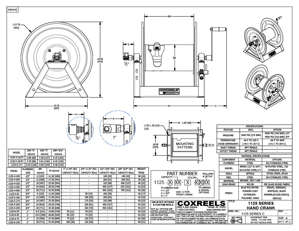 This Coxreels 1125 Series hose reel is designed for air, water, oil, or pressure washer applications and is manual rewind by hand crank action. The reel can be mounted to a floor, wall, ceiling, bench, or truck. It has a steel A-frame construction for strength and durability and 2-point axle support for stability during operation. Professional grade, heavy duty steel construction coated with a durable proprietary CPC Powder Coat Process. Rolled edges and ribbed discs for strength and safety. It has a brake assembly for braking or for locking the drum to a desired length of hose. It has a working pressure of 3,000 pounds per square inch (psi) and a maximum temperature rating of 275 degrees F. This hose reel is suitable for use in lawn care, grounds maintenance, pressure washing, steam cleaning, washdown, and fire protection applications. Leading 2-Year Manufacturer's Limited Warranty. Made In The U.S.A. Coxreels manufactures hose, cord, and cable reels and accessories. The company, founded in 1923, is headquartered in Tempe, AZ. NOTE: Includes Coxreels Hose Reel ONLY; no hose, fittings, roller guides, etc. Click on the Coxreels link above the product title to visit the Coxreels brand page to see more quality products from Coxreels.