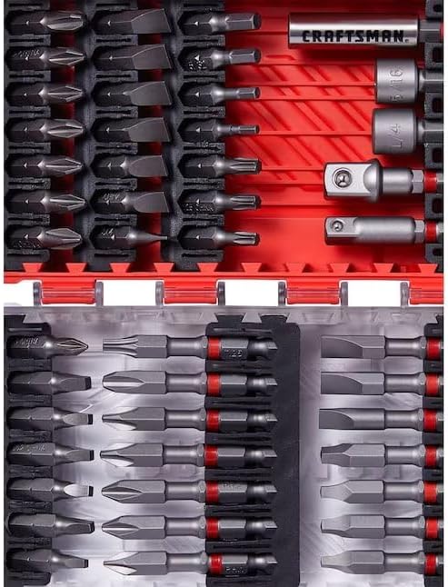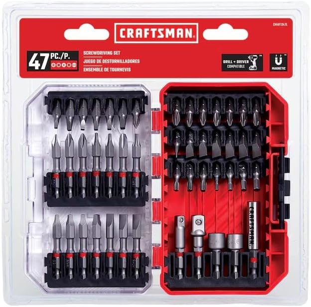 CRAFTSMAN Screwdriver Bit Set 47 -Piece The 47 Piece Craftsman Screwdriving Bit Set is engineered for Drill and Impact Compatibility. Each bit features an optimized tip geometry for improved fitment and reduced camout. Connectable accessory storage system to optimize storage space SHOCK RESISTANT: Constructed with shock-RESISTANT tool steel for maximum durability PRECISE FIT: CNC-machined bit tip ensures precise fit in screw heads reducing opportunity for cam-out Common applications include wood, metal, masonry, PVC