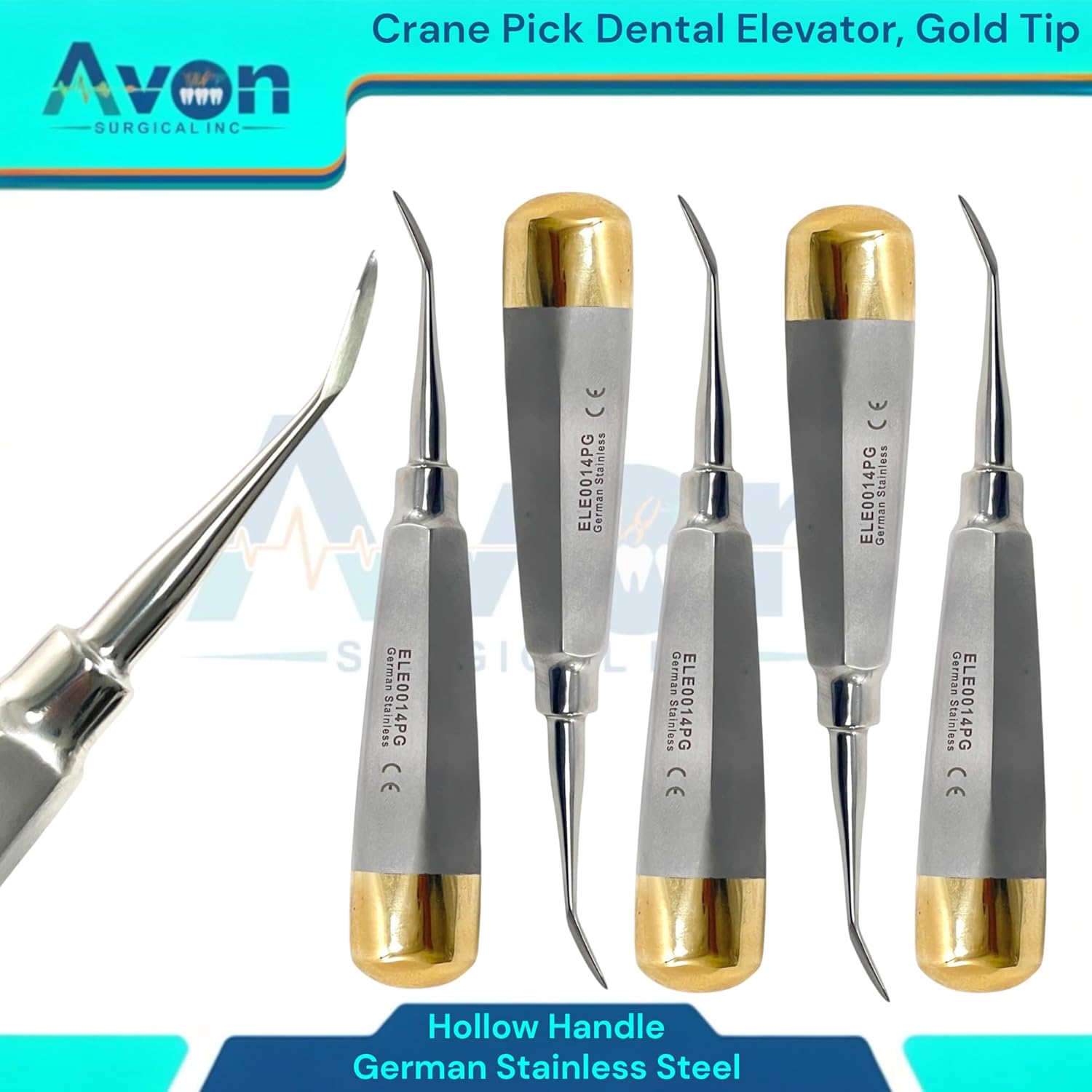 Includes: Set of 5 - Crane Pick Dental Elevator, Slight Bent Tip, Gold End Hollow Handle - German Stainless Steel. Crane Pick Tip Design: The unique crane pick tip is specifically designed to provide optimal access and leverage during tooth extractions. Its fine, tapered shape allows for precise engagement of the periodontal ligament, minimizing trauma to surrounding tissues. The design facilitates effective luxation and removal of teeth, even in difficult or impacted cases. German Stainless Steel: The elevator is manufactured from German Stainless Steel, known for its superior strength, corrosion resistance, longevity, smooth surface, and non-porous nature, facilitating easy cleaning and preventing bacterial buildup. Gold End Hollow Handle Design: The hollow handle design significantly reduces the overall weight of the elevator, minimizing hand fatigue during prolonged use, enhancing tactile sensitivity for improved control and precision, and providing an ergonomic shape for a comfortable and secure grip, reducing hand strain and improving maneuverability. The gold handle enhances visibility and adds a touch of sophistication.