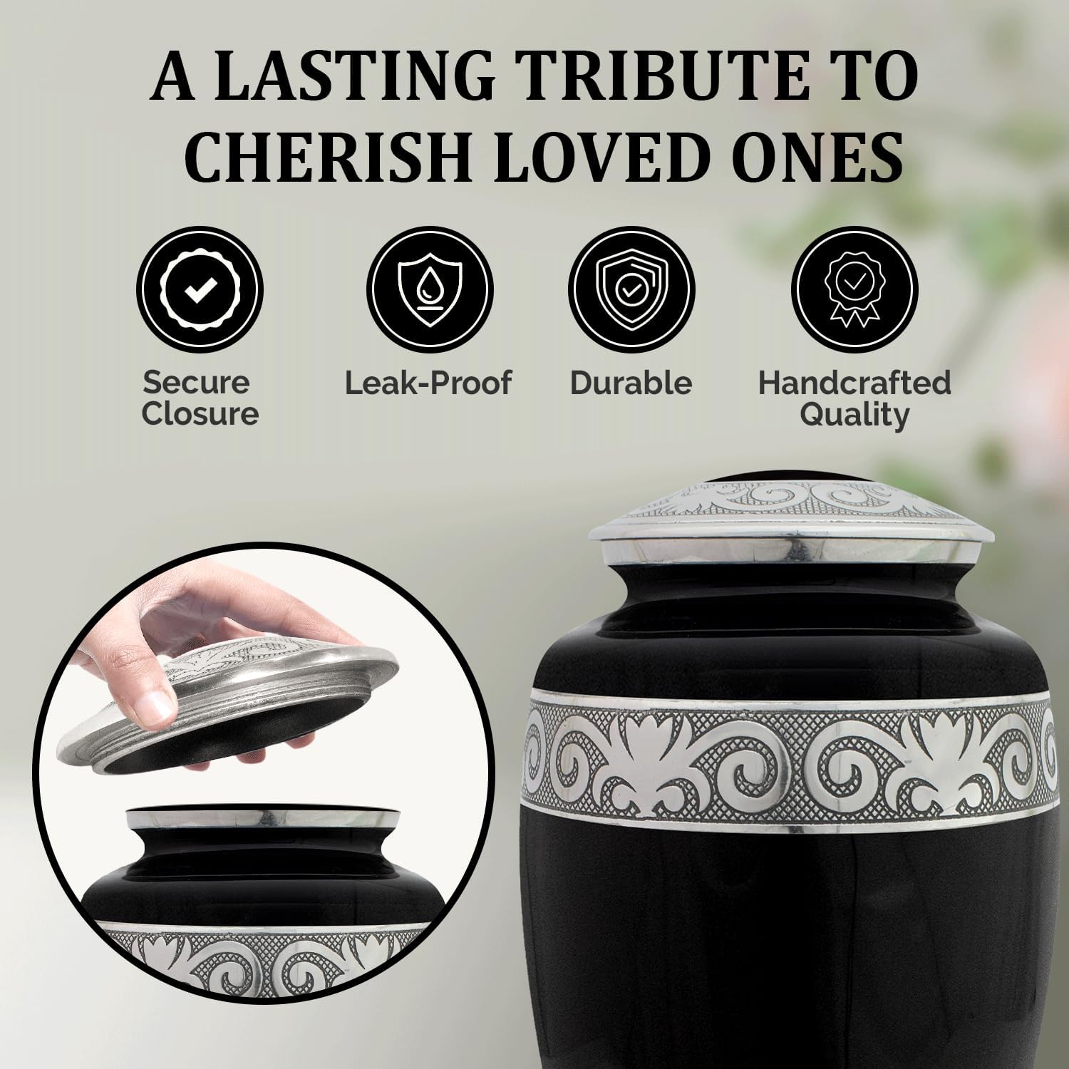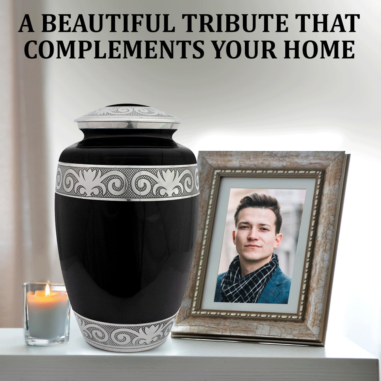 • ✅ Timeless Craftsmanship: Featuring a sleek black finish with intricate silver engravings, this urn for ashes adult male brings beauty, strength, and reverence to any room or resting place.