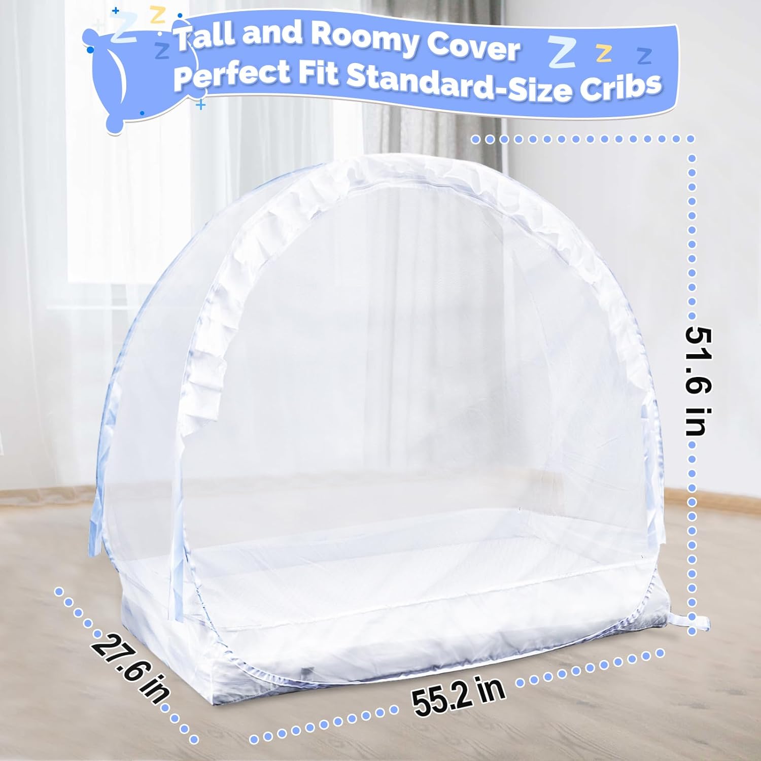 • EASY TO INSTALL WITH POPUP DESIGN: The crib tent (55.2''L x 27.6''W ) fits standard size cribs to ensure a perfect fit and secure. Build a brand new safe house for baby by only 4 steps: 1. Take the crib tent from package, and it will popup to form into shape. 2. Put the tent into the crib. 3. Put a crib mattress - fix the shape further. 4. Tie its 8 straps to the crib to ensure a snug fit - prevent active babies from deforming the tent(Please refer to the place on the image).