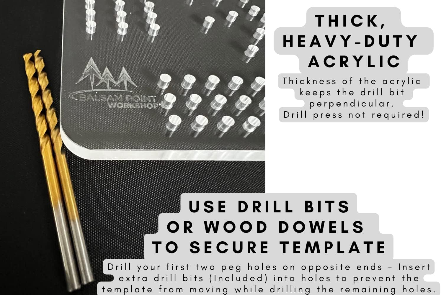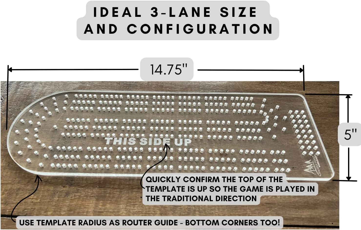 Whether you’re crafting 1 or 100 cribbage boards, this heavy-duty acrylic template will help guide the drilling on hundreds of holes to ensure your game boards are built with even and consistent hole spacing and groupings. The Balsam Point Workshop template is designed to last and perform with ease. Just follow the simple steps below to create keepsake cribbage boards to give as gifts or keep for yourself.1) Secure the template to your game-board work surface by either using double-sided tape or simply blue painter’s tape over the surface of the template.2) After drilling one hole on both the top and bottom portions of the board, insert the shank of a spare drill bit or 1/8” wood dowel to make sure the template doesn’t move while drilling the remaining holes.3) Use the sturdy acrylic template as a router guide as well to shape the outside edge of your cribbage boards.4) Add your own unique design, colors and art to your game boards to personalize each board, identify the skunk line, or distinguish player lanes and point groupings!