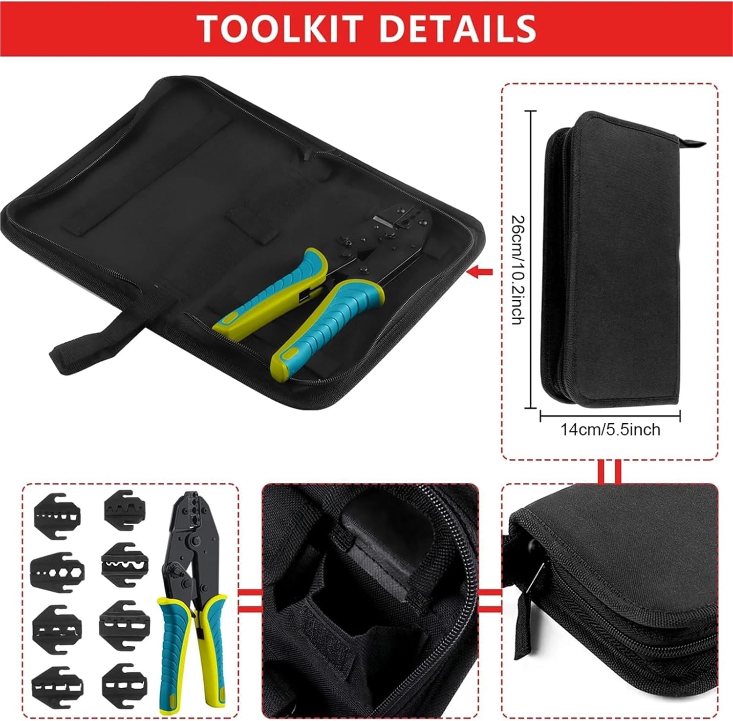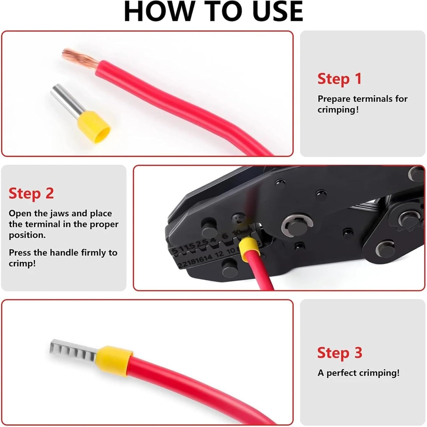 Bolt CuttersVERSATILITY: 9 quick-changing dies(modularity), crimping range: 20-2AWG(0.5-35mm2). Works with insulated terminals,open barrel,non-insulated UT&OT terminalsinsulated and non-insulated ferrules,heat shrink connectors,Solar connector.EASE OF USE: The adjustable ratchet enables the crimping tool to apply precise pressure to various terminals and connectors. The quick-release design of the product makes it only takes a moment to replace the dies.SAFETY: Terminals and connectors are crimped by squeezing the handle through a complete ratcheting cycle until the handle releases automatically. This process can improve the safety of the tool.CONVENIENCE: Made for an easy install. Ergonomic handle design allows you to save energy, which makes your operation easier and faster, a great time & labor saver==========Handle Style : StraightFeatures : INSULATEDApplication : Crimpingis_customized : YesType : Slip Joint PliersPlier Style : EuropeanMaterial : Carbon SteelDIY Supplies : Electrical