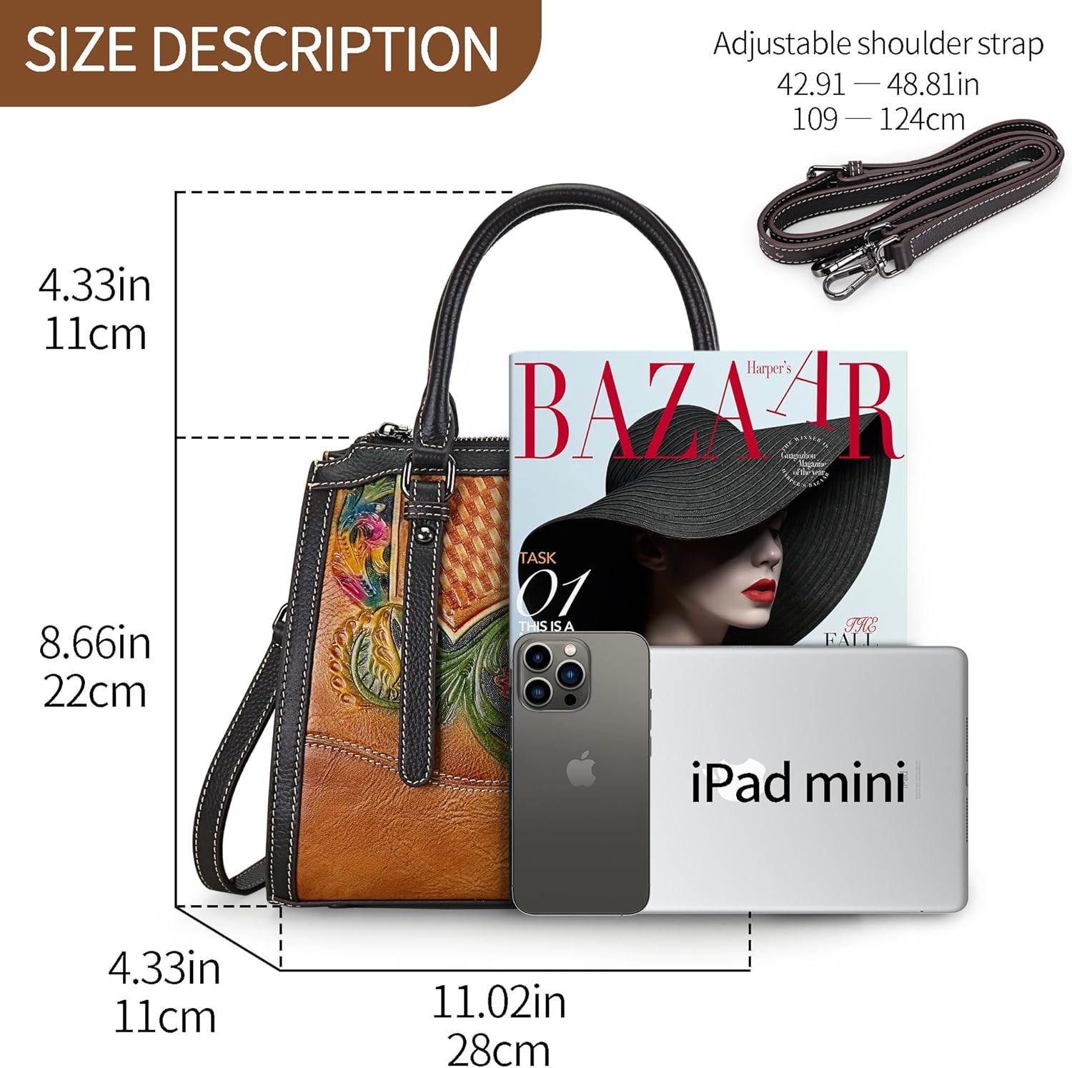 Size: 10.83inch(buttom length)*9.06inch(height)*4.33inch(width) Weight: 1.48lb Package include: 1 x Beautiful Handbag. 1 x adjustable removable strap. It can hold many items, such as mobile phones, cosmetics, iPad, books, glasses, mobile power supplies, wallets, keys, etc. It is very convenient for dating, hiking, camping, commuting, shopping, going to school, etc. Rose embossing leather handbag The uniquely designed handbag is hand-sewn by professional workers, showing a strong retro style and bringing you a comfortable experience. Our products have undergone strict quality inspection, neat stitches, no thread ends, and products without defects can be allowed to be sold. We pay more attention to the buyer's service and shopping experience. If you are not satisfied with our services or products, please let us know and we will do our best to serve you. Attention:The leather has a nature smell. When first use, please expose it to the air about three days, the smell will go away.