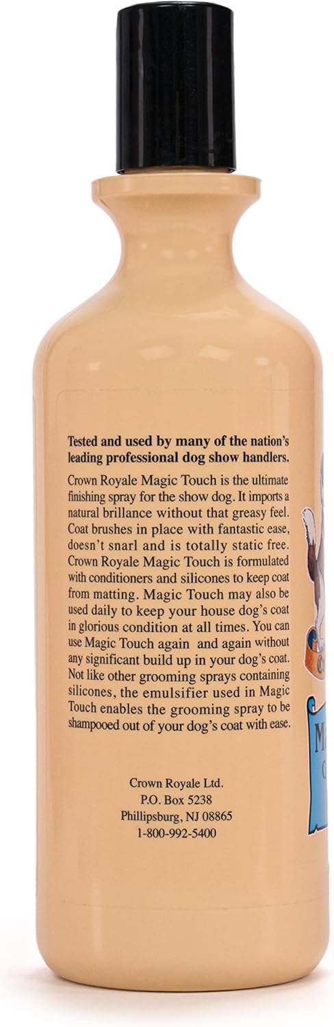 | Directions | 1. Shake the bottle well before use. 2. Dilute product as needed, following recommended ratio of 1 oz Magic Touch to 15 water. 3. Spray solution evenly onto your pet's coat. 4. Gently brush fur distribute and remove any tangles. 5. Allow dry for best results. |