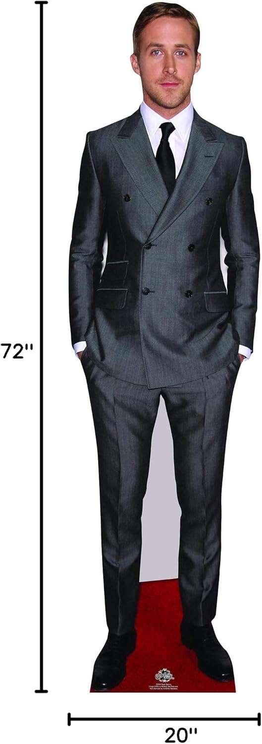 CS569 Ryan Gosling Lifesized Cardboard Cutout Standup. Show your love for Ryan Gosling with this life-size cardboard cutout standup! It is printed on eco-friendly, recycled cardboard, using a high definition digital die cut printing process that creates the highest quality display. Perfect for fans of all ages to add a fun touch to any home, bedroom, office or classroom. We carry most product in stock and our inventory is print on demand. Put a smile on your face today by bringing home this classic and stylish standee standup! 72 inches x 20 inches