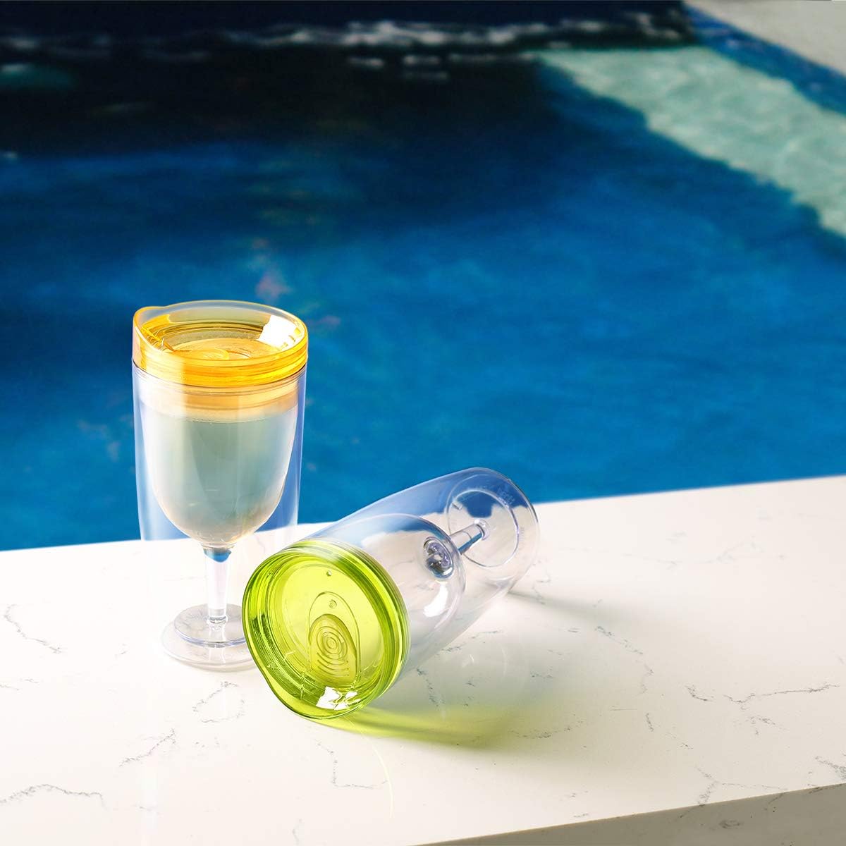 This set come with 8 wine glass in 1 of each red, orange, pink, yellow, lime green, sky blue, teal, and purple colors. Relax by the pool in style with the double wall insulated wine tumbler. These tumblers are acrylic plastic double wall wine cups, with many benefits over the standard wine glass in lots situations. The sliding top lid keeps bugs and dirt from getting in your wine while relaxing at the beach or in the garden. The double walled design of this BPA- free tumbler also keeps your wine cool for longer by insulating the exterior wall from the interior drink compartment.
