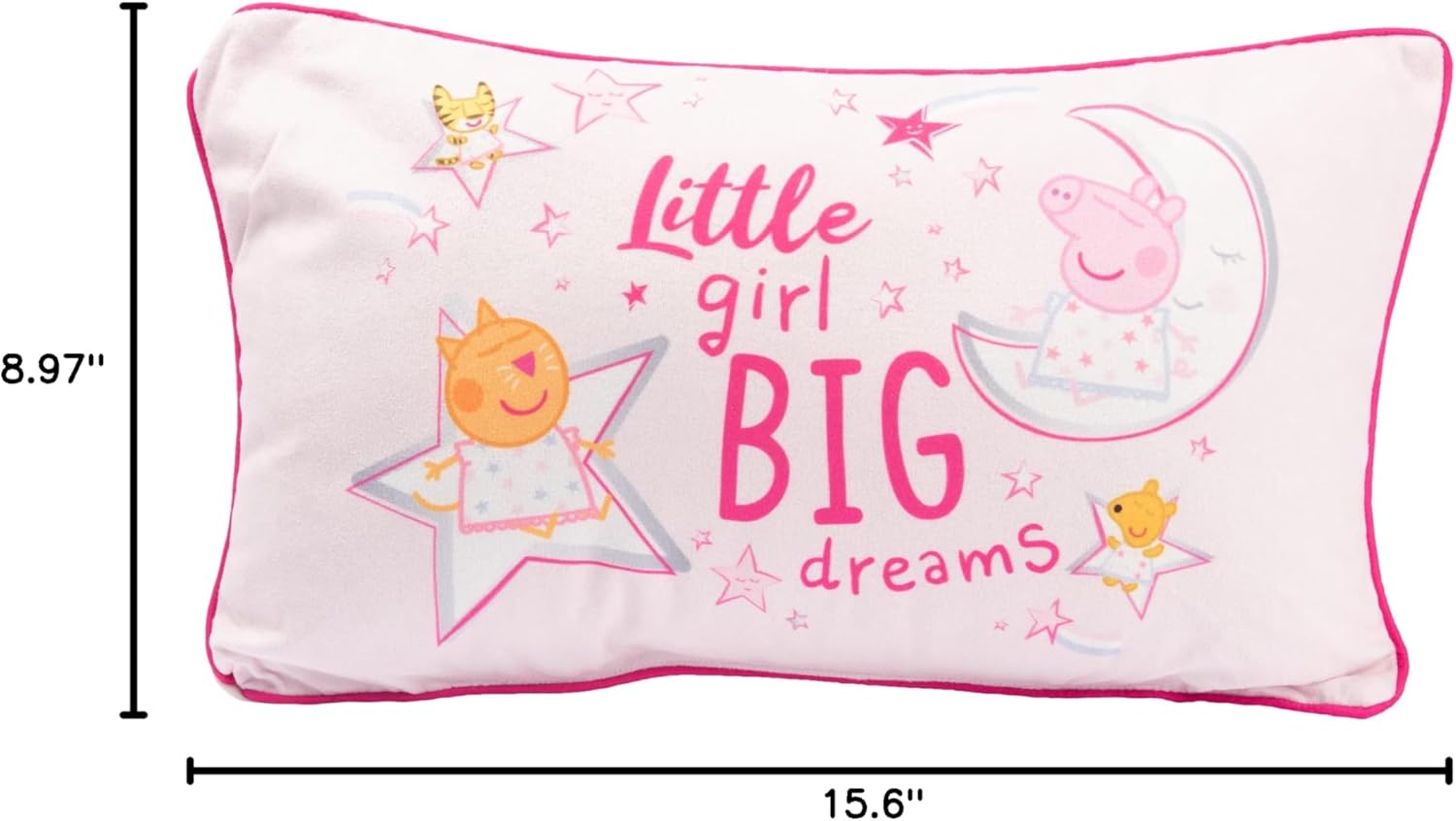 Peppa Pig Cushion - Little Girl Big Dreams Plush Decorative Cushion Pillow Pink 40 x 23 cm This cushion is the very special decorative cushion for all Peppa Pig fans. Whether as a decoration for the sofa, as a cushion in the car or as a cuddly cushion in bed, the cushion with the Peppa Pig print and the lettering "Little girl Big Dreams" on the front is an absolute eye-catcher. The size of 40 x 23 cm also makes the cushion a great seat cushion on which you can make yourself comfortable for reading or playing on the floor! A great cuddly and decorative cushion for small and large fans of Peppa Pig Product details: - Dimensions: approx. 40 x 23 cm. - Material: polyester. - Front with Peppa Pig print, back plain colour. Care instructions: - Washable at 30 °C on a delicate cycle. - Do not bleach. - Do not tumble dry. - Do not iron. - Do not dry clean.