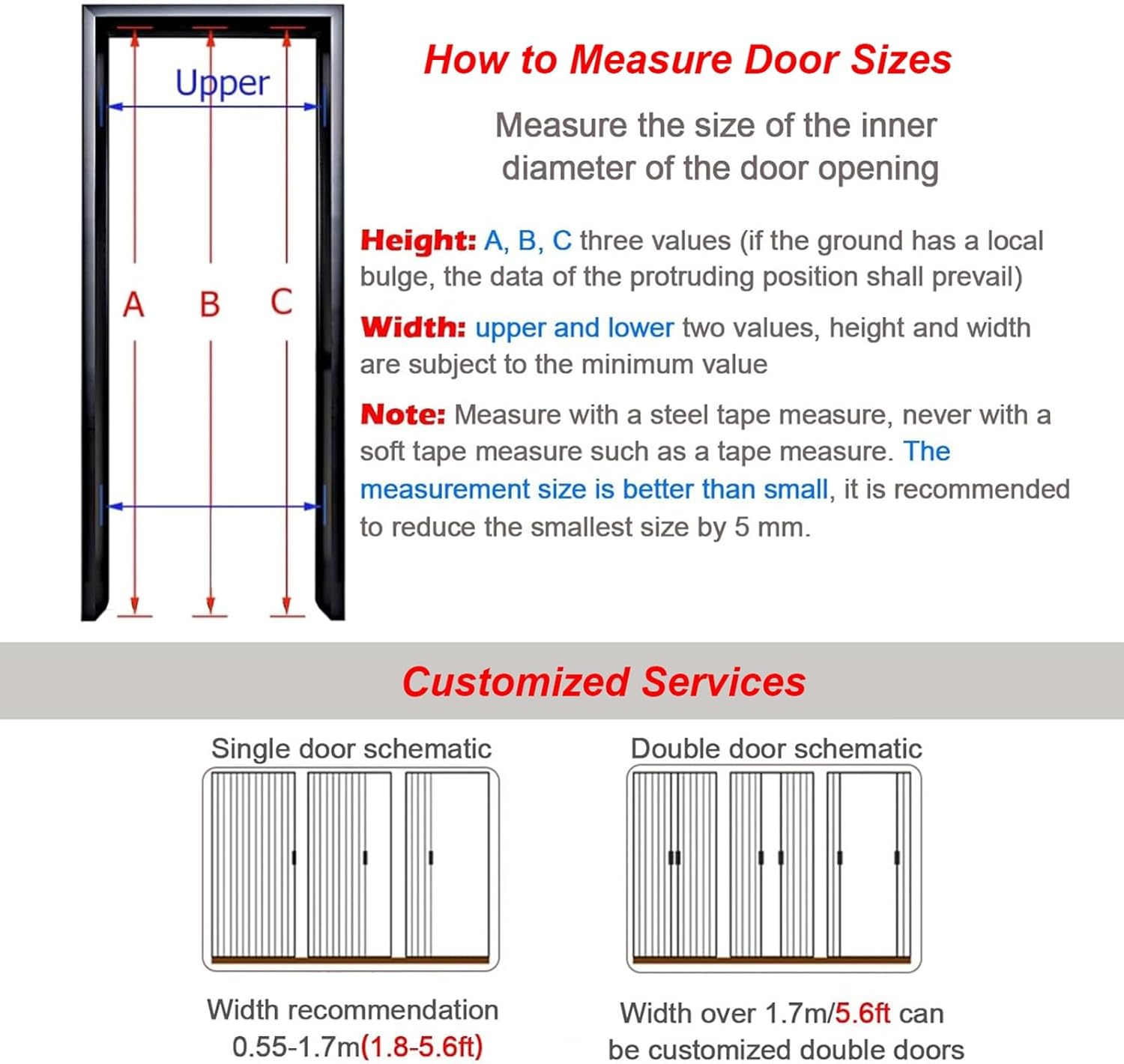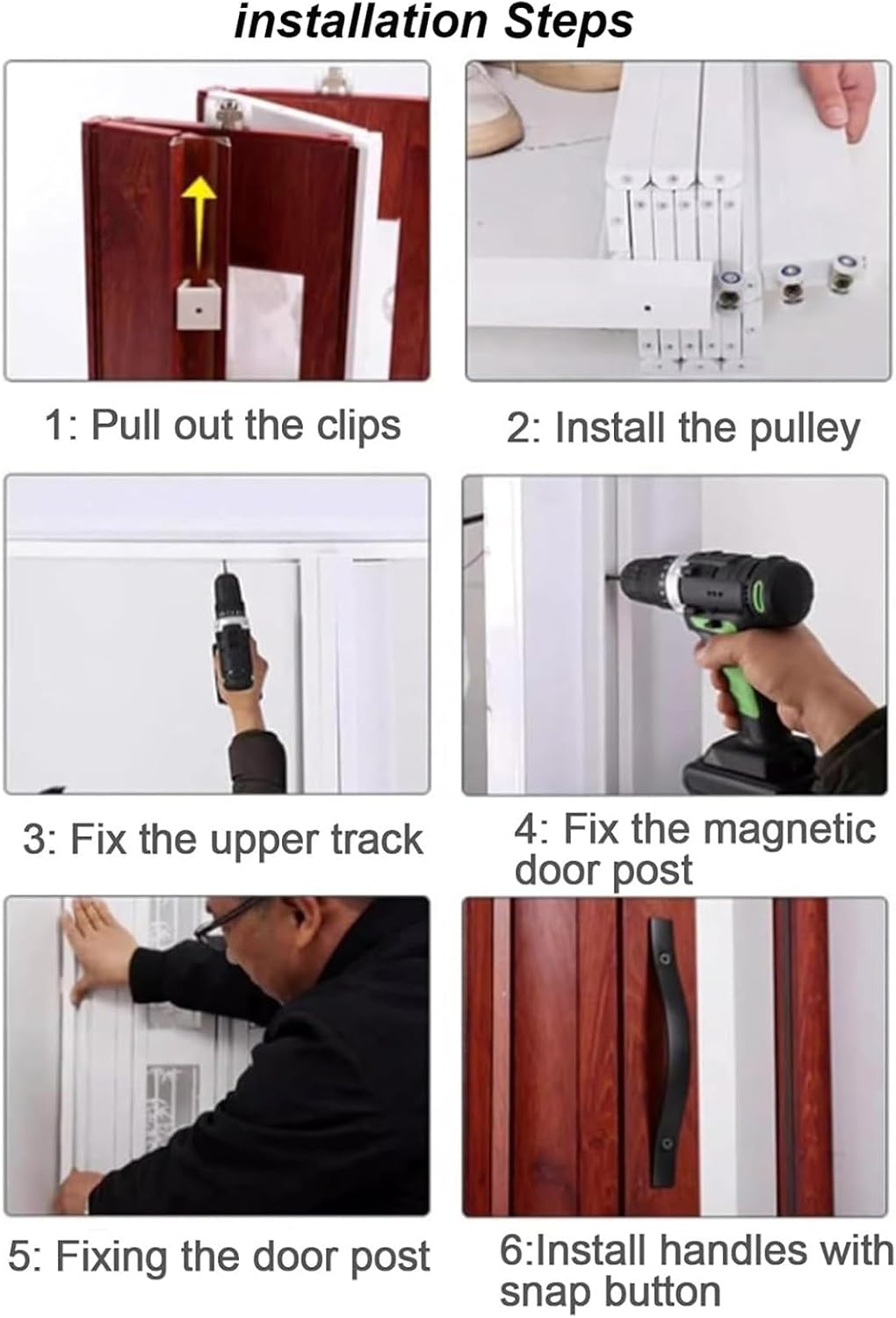 Metal Frame Indoors Security Patio Door:Description:- Experience the perfect blend of style and functionality with our innovative folding door, designed to save space by folding down to just 10% of the area typically occupied by traditional doors. Ideal for modern homes, this door features a sleek design with hidden folding mechanisms, super magnetic suction, and waterproof properties, making it suitable for various settings including closets, bedrooms, doorways, showers, and kitchens.Specification:- Material: Durable Aluminum Alloy- Color: Elegant White Panel + White Frame- Width: Customizable from 61-203cm (24-80in)- Height: Customizable at 203cm (80in)Features:- Enjoy enhanced privacy with a lockable design that blocks views- Smooth operation ensures easy opening and closing without sticking or jamming- Sturdy aluminum panels are built to resist warping, cracking, and fading over time- Replace standard doors to maximize your living space and improve functionality- Lightweight and flat construction ensures durability and ease of maintenance- Contemporary aesthetics that elevate the look of any room- Effectively reduces noise, helps control room temperature, and prevents fumes and light intrusion, making it pet-friendly too.What’s Included?1 x Pull Down Honeycomb Folding DoorWarm Tips:1. Please allow a 1-3cm margin for manual measurement.2. A slight odor may be present initially; this will dissipate within two to three days.