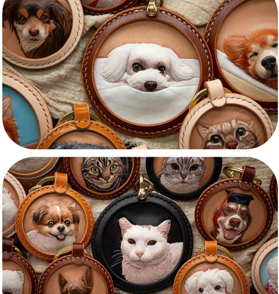 We custom all the pet animal , including but not limited to Cat/Dog/Rabbit/Fish/Birds/turtle/horse... *How to Custom 1. I need a clear photo with good lighting, primarily of their face. Otherwise, I can't get all the detail. 2. You can add some words or name of the pet or I will leave it blank. 3.Send me the photo and words via the message after you checkout Processing time: the Making time varies from 5 days to 30days depending on the orders I have .So we can't accept the urgent orders Looking for a unique way to memorialize your beloved pet? Look no further than our Custom Handmade Leather Carving & Painting Pet Memorial Pendant/Keychain! This stunning piece is perfect for pet lovers looking to keep their loyal friend close to their heart. Crafted from high-quality leather, each pendant/keychain is handmade with care and precision. The personalized leather engraving adds a special touch, making each piece truly one-of-a-kind. Our custom leather carving process allows you to choose from a variety of designs and styles, ensuring your pet's memory is honored in a way that reflects their unique personality and spirit. Whether you're looking for a beautiful art gift for yourself or a loved one, our Custom Handmade Leather Carving & Painting Pet Memorial Pendant/Keychain is sure to impress. Perfect for dog, cat, bird, rabbit, and horse pet lovers alike, this piece is a timeless tribute to the love and devotion that our pets bring into our lives. In addition to its sentimental value, this personalized leather keychain/bag pendant also serves as a practical accessory for everyday use. Top-quality craftsmanship ensures it can withstand the test of time, making it the perfect keepsake to treasure for years to come.