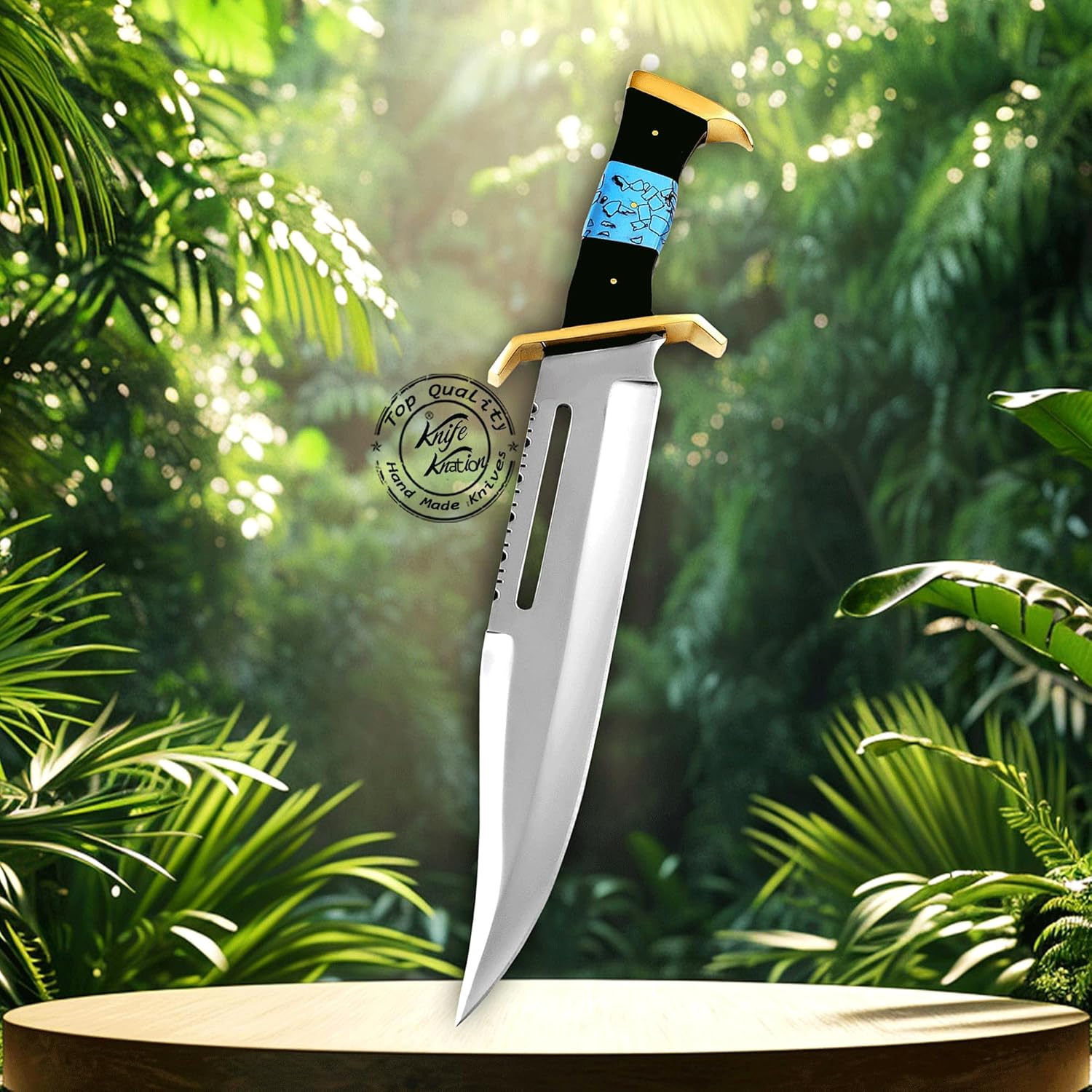 ✅ Custom Handmade Stainless Steel Rambo Style Bowie Hunting Knife, Fixed Blade Knife, Bowie Hunting Knife, Hunting Knife, Camping Knife, Knife with Premium Leather Sheath, KKH-45 ✅ DIMENSIONS: Overall Length: 16.00 inches; Blade Length: 11.00 inches; Handle Length: 5.00 inches. Black & Turquoise Handle with Brass Pommel & Guard. ✅ STUNNING LEATHER SHEATH, This 16.00 inches Large Bowie Knife with sheath, It is Mirror Polished Stainless steel bowie knife, this shiny razor sharp huge bowie knife is suitable for any use. It can be used as a hunting knife for deer, survival knife, camping knife, outdoor knife, cool knife. Due to high-quality stainless steel, it will never get rusted and also will hold sharpness for a long time. ✅ CHRISTMAS GIFT: Needed thing for those who keen on fishing, hunting, camping and spending time actively. A great gift for true connoisseurs of knives. Stocking Stuffers. ✅ BUYER'S SATISFACTION FIRST - 100% fulfillment and Money Back . In case there are any issues with the buy, kindly go ahead and reach us, We will give the best help to take care of the issue.