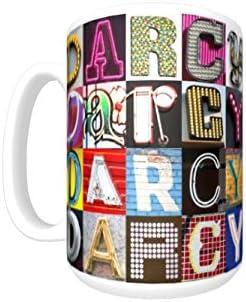 Personalized "DARCY" coffee mug. The mug features DARCY in photos of sign letters showcased on both sides of mug. The mug is dishwasher and microwave safe and meets all FDA standards for safety and toxicity. Orders shipped directly from the printer typically within 2-3 business days.