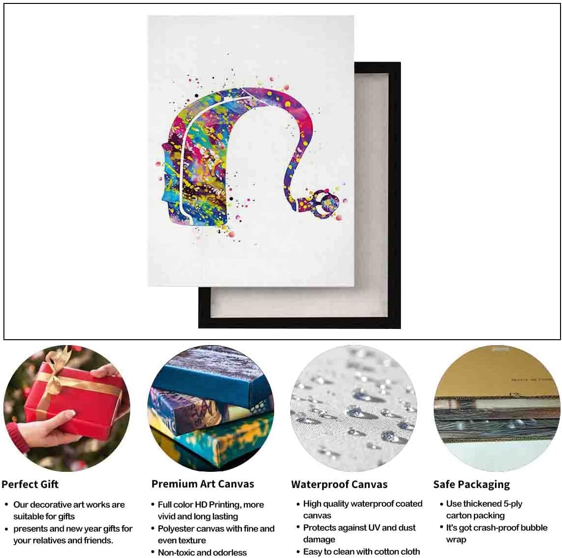 Hearing Aid Watercolor Print Cochlear Implant Art Deaf Gift Audiologist Audiology Art Ear Diagram Clinic Office Decor Medical Art- The inner frame of the decorative painting is made of high-quality pine wood, which is not deformed, and the binding is firm! Inner package contains accessories 1、 Decorative painting has been installed on the wooden frame 2、There is a buckle on the back of the frame, which can be suspended directly 3、Comes with dust-proof gloves to avoid contamination caused by hand contact with the product 4、 Comes with a level for measuring the installation position. 6、Bubble film packaging can effectively prevent transportation damage high definition printing High quality canvas printing, pictures and photos printed on high quality canvas, durable, crease-resistant and waterproof, inkjet printing, fade-resistant ink, high-end digital printing, light weight, easy to hang, Various sizes We provide 4 regular sizes for you to choose from, choose a larger size for a simple wall area or buy several sets at one time to match the decoration more beautifully. Attention to detail Our in-house design team constantly checks the quality and details of each piece of art to ensure that the products shipped are free of any flaws, available for any occasion you need Excellent decorative effect