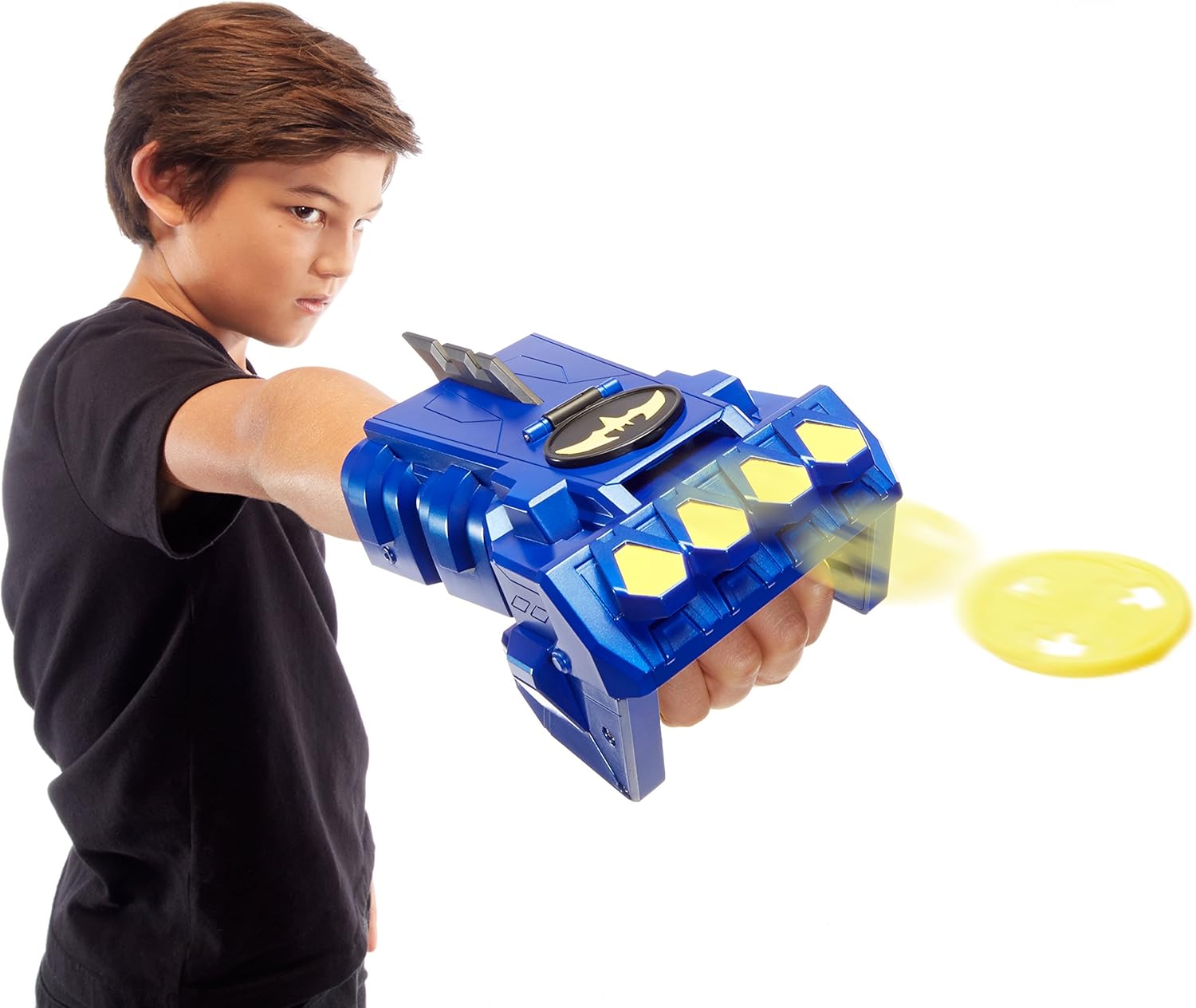 Join the action seen in Batman Unlimited: Mechs and Mutants with this authentic Batman gauntlet. The bright, iconic glove slides on easily as you chase down the mutant DC Super-Villains plaguing Gotham City! When you catch them, activate the trigger and fire Batarang discs out of the Gauntlet and take the gargantuan enemies down! Includes 4 firing discs and also works with Batarang discs from the Batman and CYBEREX figure, sold separately, subject to availability. Put on your Batman battle gear and save the day like the Caped Crusader! Colors and decorations may vary.
