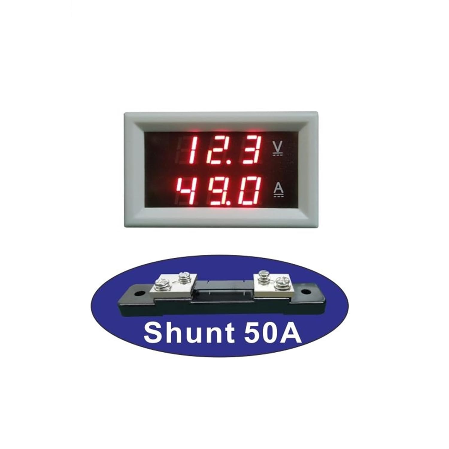 AmmetersDC 3.5-30V Shunt 50A 75mV DC Voltage Current Meter Volt Tester Voltmeter Ammeter Black White Cover Multimeter Red Blue DigitsTechnical Parameters:Dimension:48*29*21 mmSupply voltage:DC3.5 ~ 30V(Note:The maximum input voltage can not exceed 30V, or be burnt.)<;20mADisplay mode: 0.28 "LED, single color or double color:(red-red): Both voltage and current are red color(red-blue): Voltage is red,current is blue. Installation opening: 45.5*26.5 mmMeasurement rate: 500mS / timeMeasurement accuracy: 1% (± 2 digits) Features:The wide power supply range, with reverse polarity protection.Display voltage and current on thescreen at the same time.The decimal point automatically shifted.The testingsideand the power supply sideof the negativeis connected.Good anti-interference ability, showing the refresh speed. With threewires,connection is convenient,used to monitor the battery voltage,can be also used for other products.Testing side:three-wire terminalsCOM(black wire): Test common terminal(TheCOMis commond negative of voltmeter and ammeter)V +(redwire): Test positive voltage inputA +(yellowwire): Test positivecurrent input.It can only be connectthe loadnegative and load power negativeWorking conditions:Operating temperature: -10 ~ +50 Working humidity: 10 ~ 80% (no condensation)Working pressure: 80 ~ 106kPaSun exposure: no direct exposure